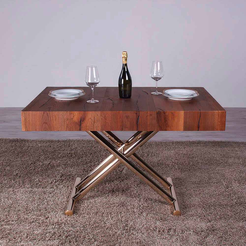 Tavolino da salotto moderno trasformabile in tavolo da pranzo con piano in legno e base in metallo Made in Italy.