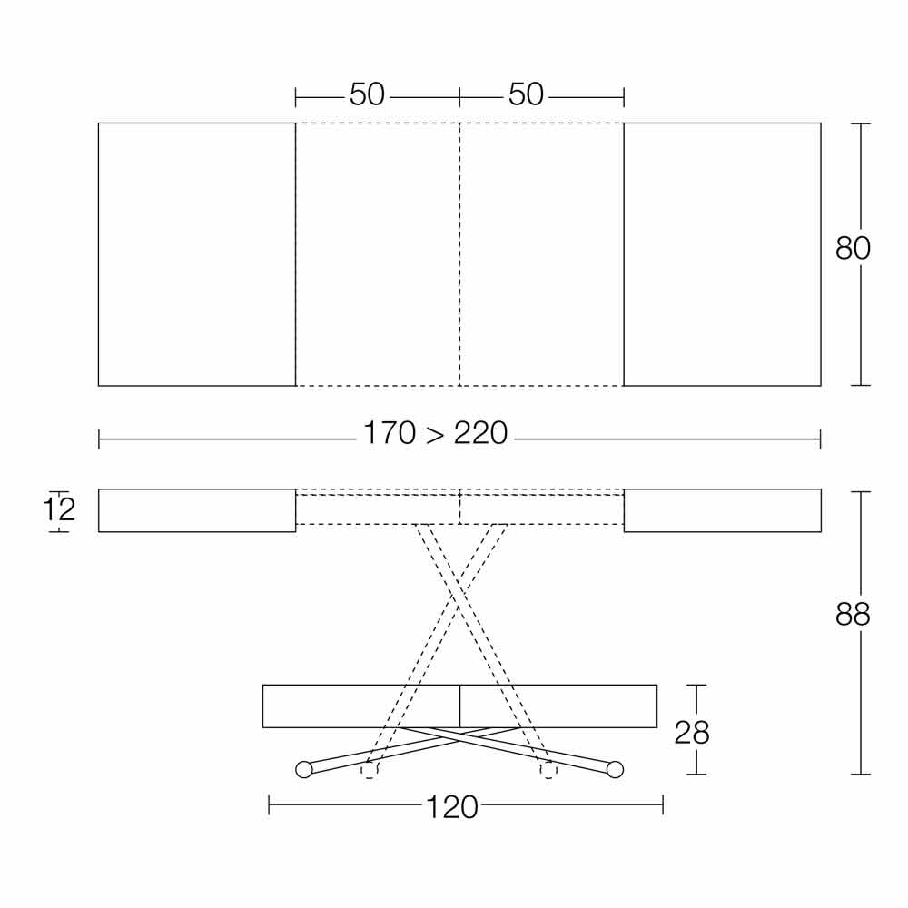 Il piano è rettangolare allungabile attraverso 2 prolunghe interne da 50 cm ciascuna.