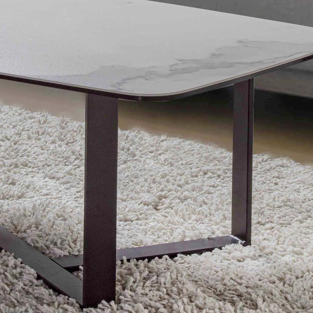 Tavolino da salotto con piano in vetro ceramica finitura bianco marmo e base in metallo verniciato nero. Essenziale ed elegante, questo complemento d'arredo dall'anima discreta è caratterizzato da un design la cui idea si basa sulla semplicità riuscendo a creare così un prodotto estremamente versatile capace di adattarsi perfettamente a qualsiasi stile di arredamento moderno. La sua struttura e le sue dimensioni lo rendono una scelta perfetta per rappresentare il principale piano d'appoggio da posizionare al centro del proprio salotto fungendo da pratico piano d'appoggio per bevande, libri, riviste o qualsiasi altro oggetto che si voglia tenere a portata di mano e al tempo stesso da raffinato elemento decorativo.