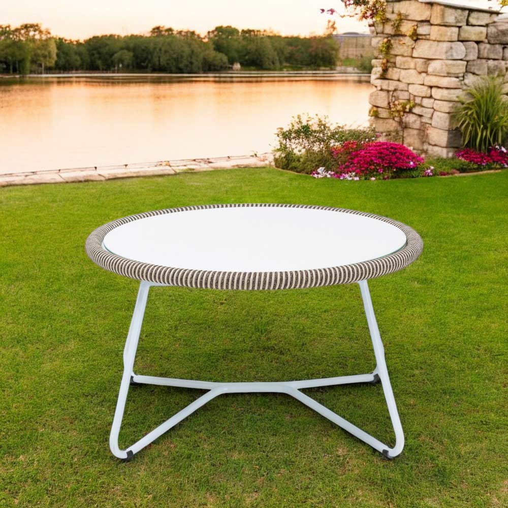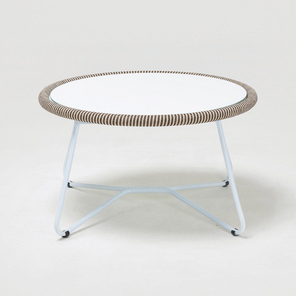 Questo tavolino da giardino è l'emblema del design che incontra la funzionalità nella sua forma più pura e stilisticamente raffinata. Il piano rotondo è abilmente intrecciato, creando un suggestivo effetto visivo che attira l'occhio e invita al tocco. La base in alluminio verniciato conferisce al tavolino una leggerezza quasi eterea, mentre assicura stabilità e resistenza alle condizioni esterne.