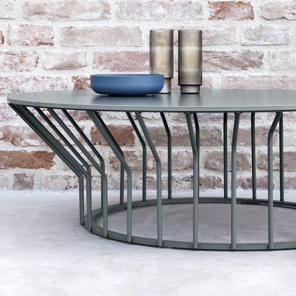 hpl. Un prodotto pensato per portare praticità, stile e colore all'interno di qualsiasi spazio outdoor, sia domestico che contract, come giardini, cortili o a bordo piscina. Il punto di forza che arricchisce l'estetica essenziale del tavolino è l'originalità del basamento composto da raggi equidistanti che partono dalla base circolare e salgono dritti piegandosi verso l'esterno su un lato per creare un particolare