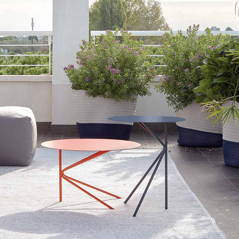 Questo tavolino per il giardino presenta un design minimale dal piano rotondo, disponibile in due diverse misure e due differenti altezze che possono essere combinate insieme per un salotto moderno ed elegante.