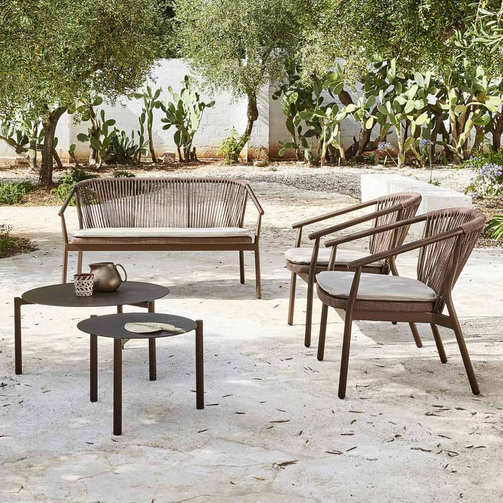 Tavolino da giardino composto da piano e struttura in alluminio verniciato a polveri nella colorazione bronzo metal. Grazie al suo design lineare, pulito e semplice questo tavolino è perfetto per arredare qualsiasi ambiente outdoor come terrazze, piscine e giardini, trovando allo stesso tempo collocamento anche nelle svariate zone living interne.