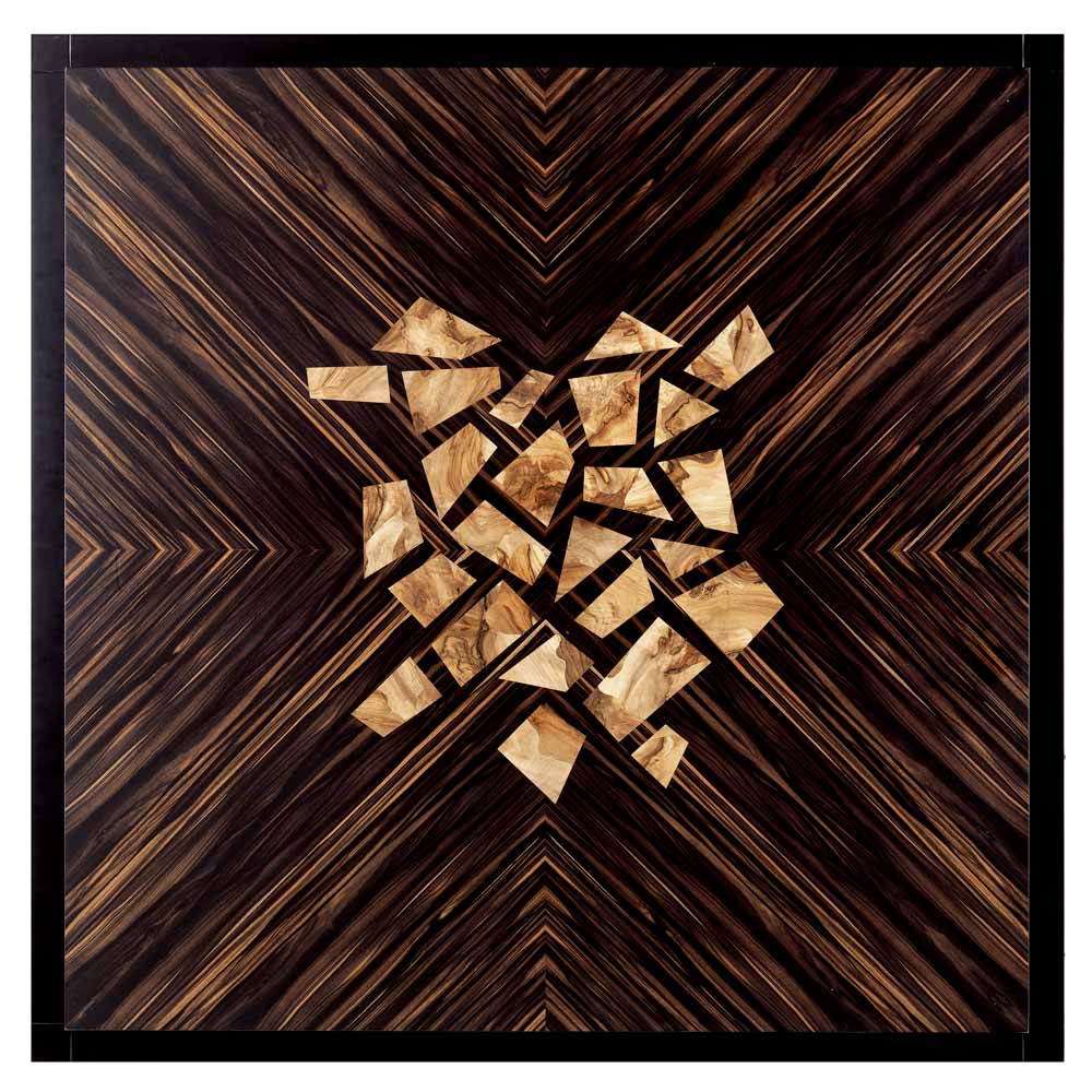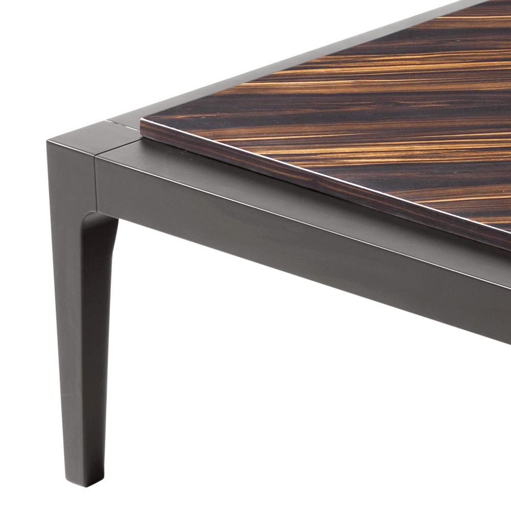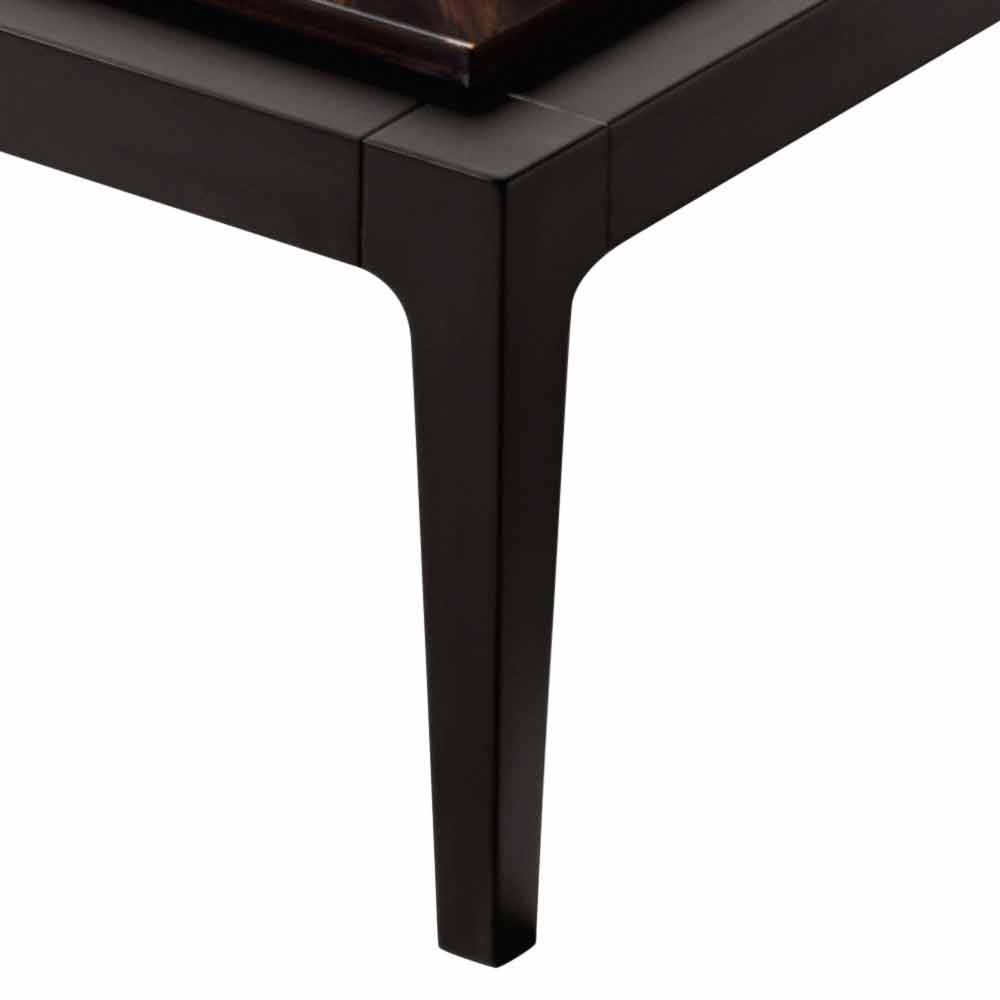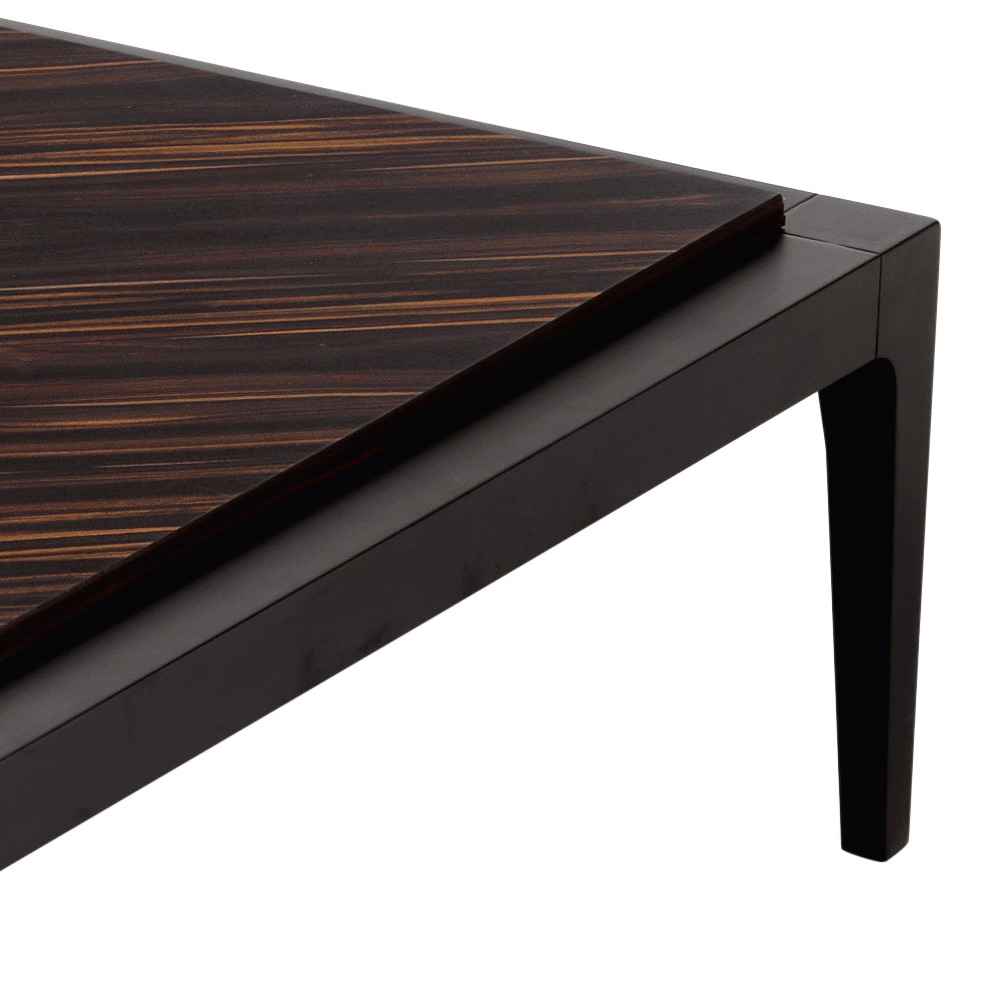 Il tavolino quadrato Zarafa ha una struttura in legno massello di tiglio, il piano in tamburato con impiallacciato di ebano e inserti a coriandolo in radica di noce.