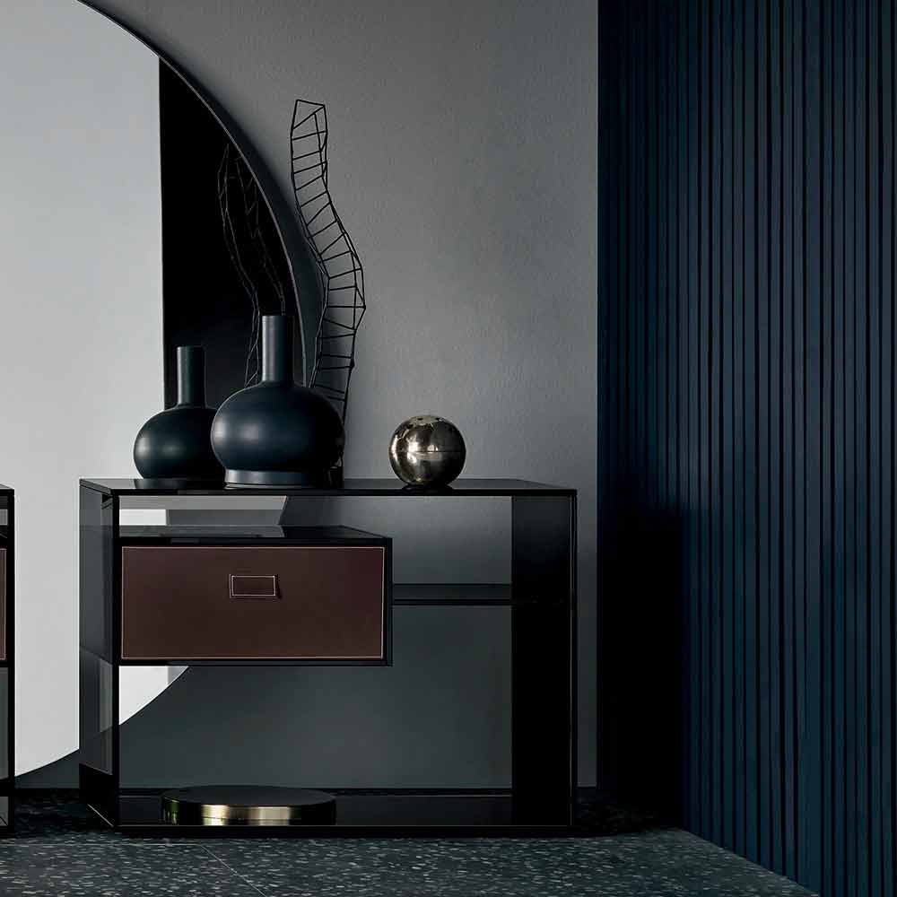 Questo tavolino lato divano o comodino si caratterizza per il suo design versatile, elegante e minimale interamente realizzato in vetro fumè con base a specchio.