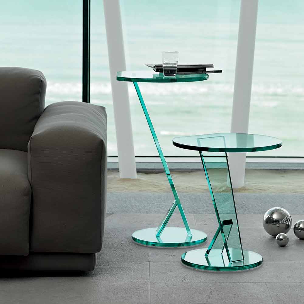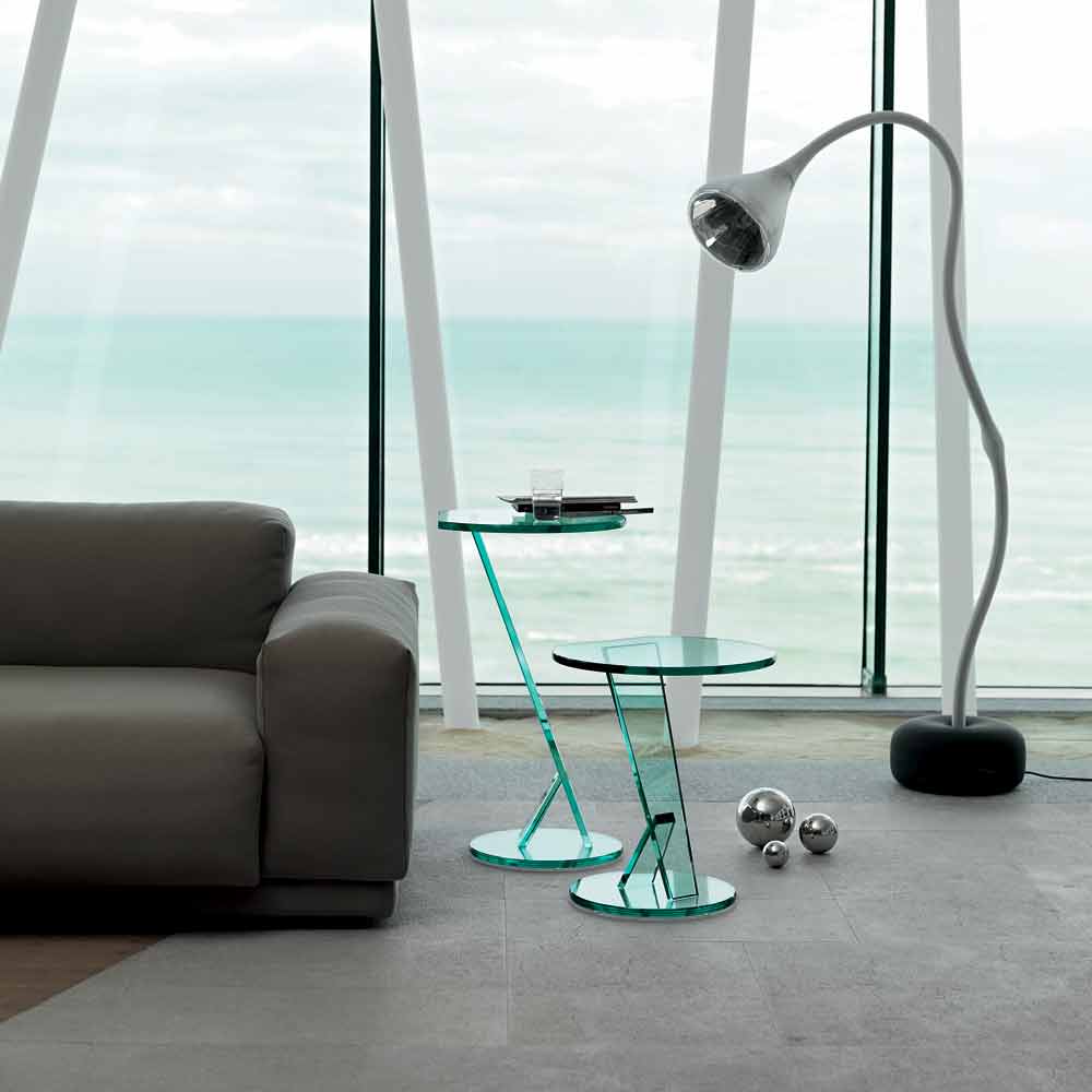 Questo tavolino lato divano da salotto si caratterizza per il suo design originale e multiuso realizzato interamente in vetro extrachiaro.