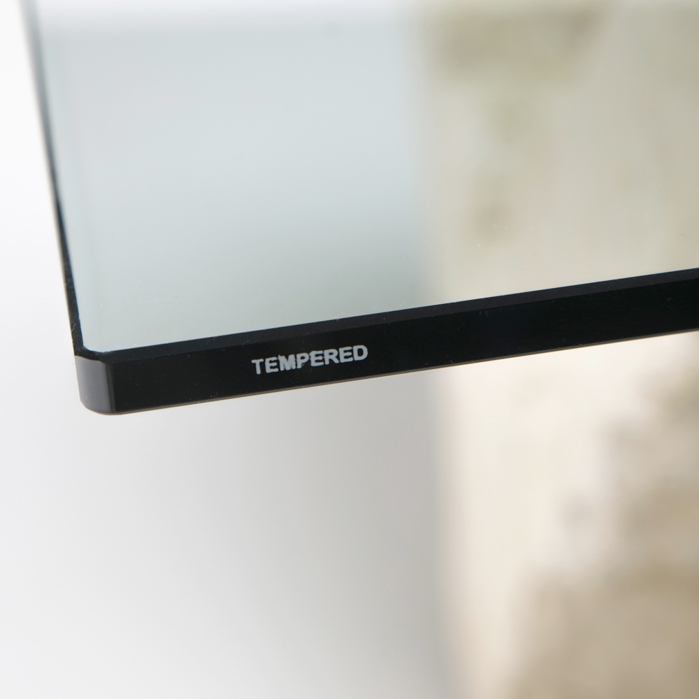Tavolino con struttura in fossil stone bianca e top in vetro 10 mm filo lucido.