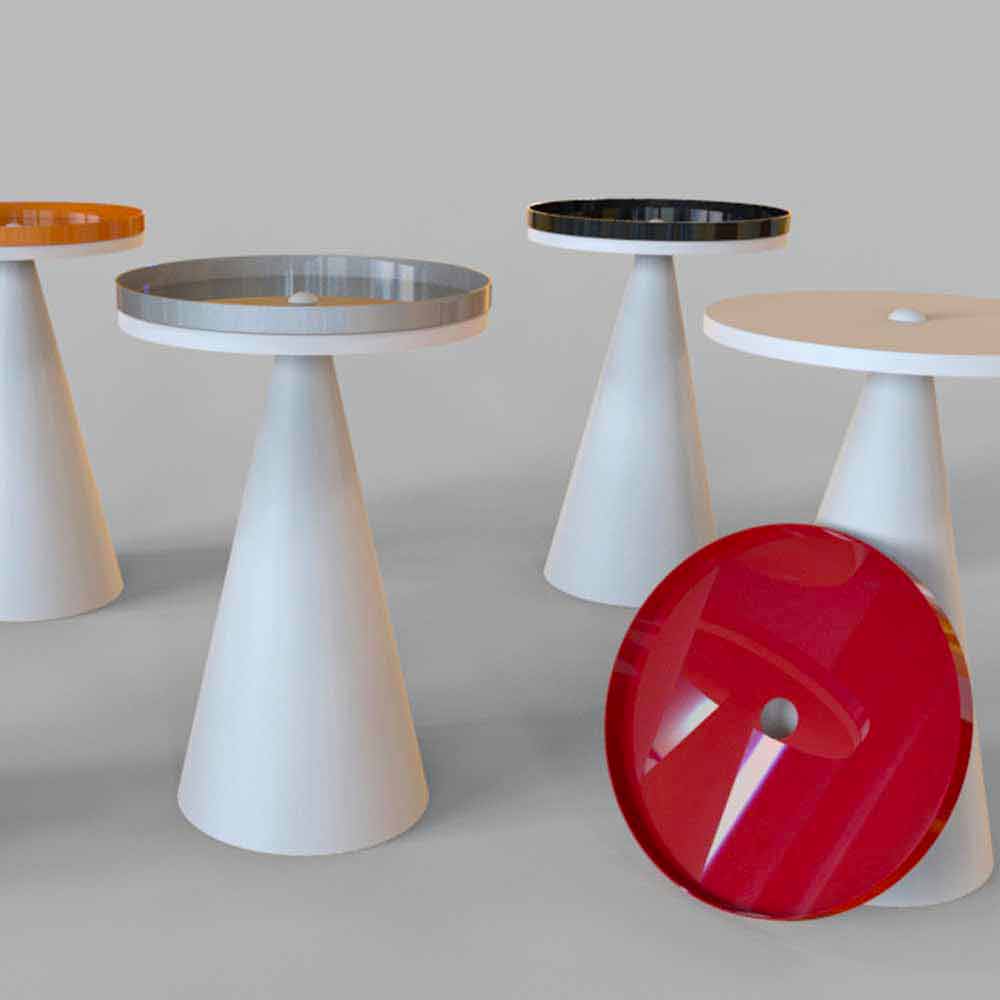 La base, realizzata in afamatx bianco opaco, contrasta con il piano superiore in lamiera verniciata lucida. Quest'ultimo può essere utilizzato separatamente aumentando la fruibilità del vassoio e garantendo al tempo stesso un doppio piano d'appoggio.