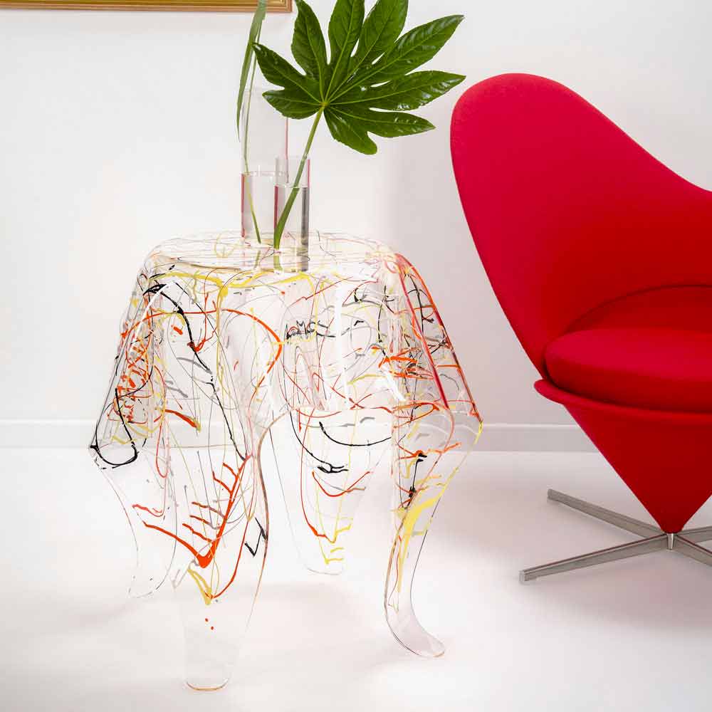 Il tavolo Otto drappeggiato è un pezzo unico, un’opera d’arte moderna. Una lastra in purissimo polimero vergine 100% di plexiglass PMMA con spruzzatura di vernice, drappeggiata a mano ad alte temperature, sino a creare un tavolino unico ed irripetibile.
