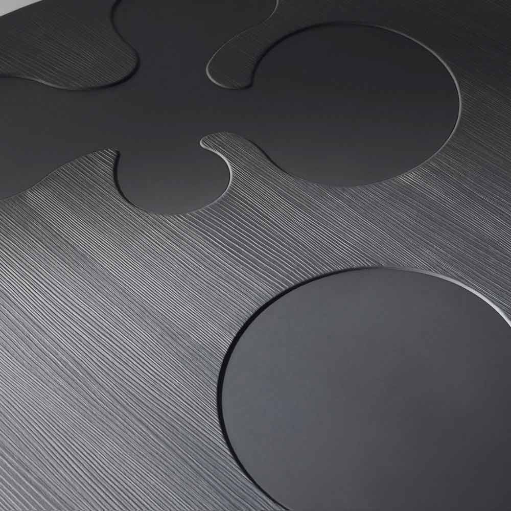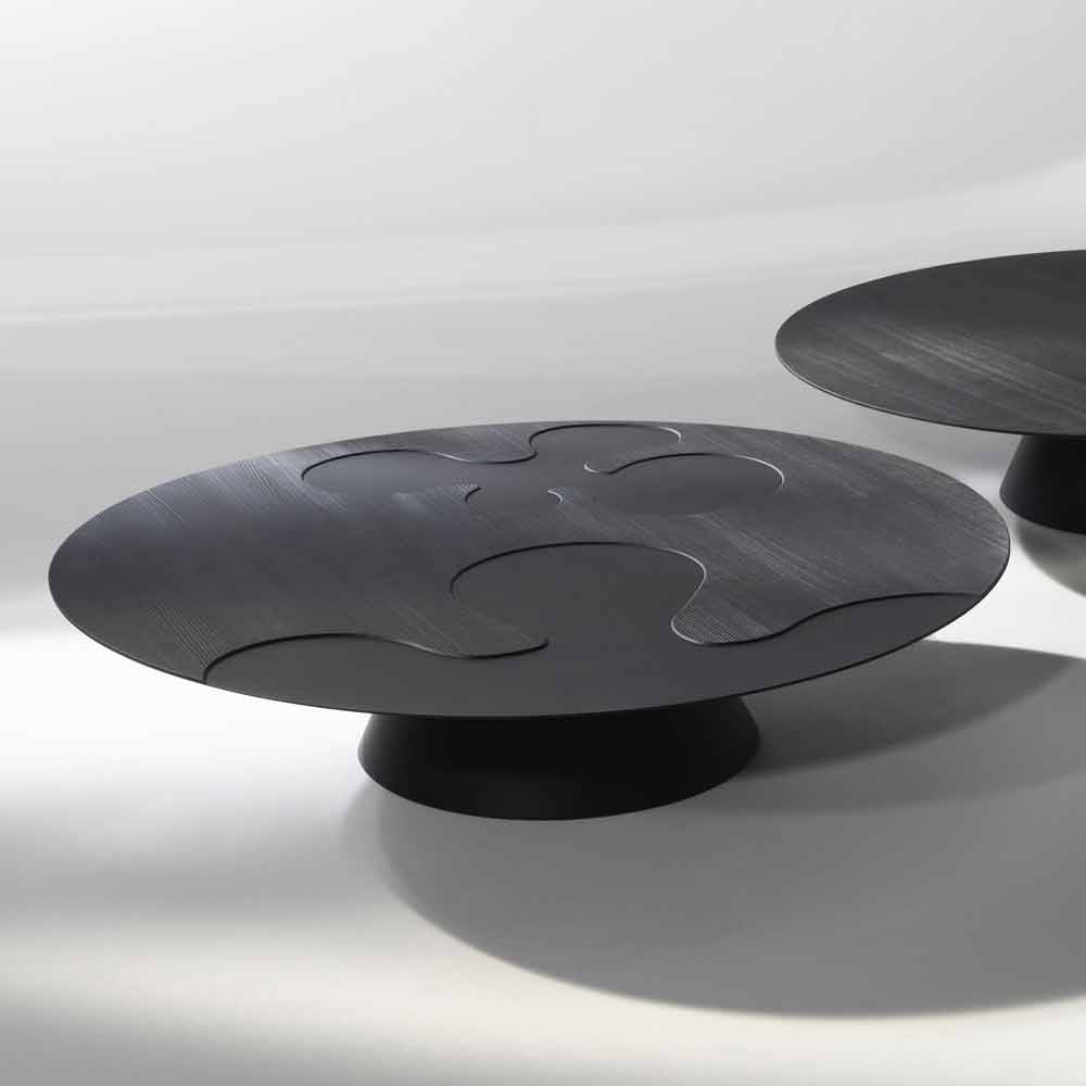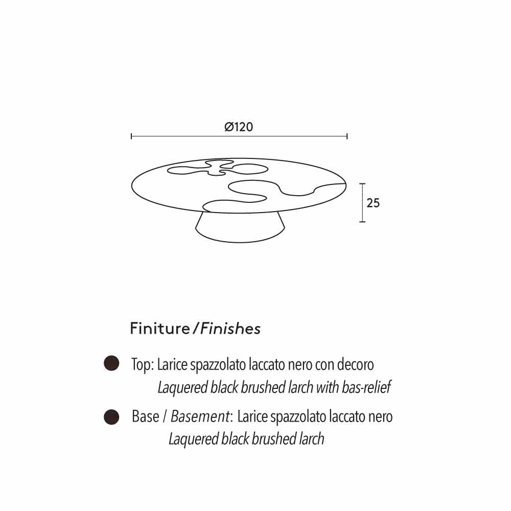 Tavolino da salotto caratterizzato da un basamento conico in larice spazzolato laccato nero. Piano in larice spazzolato laccato nero con decoro.