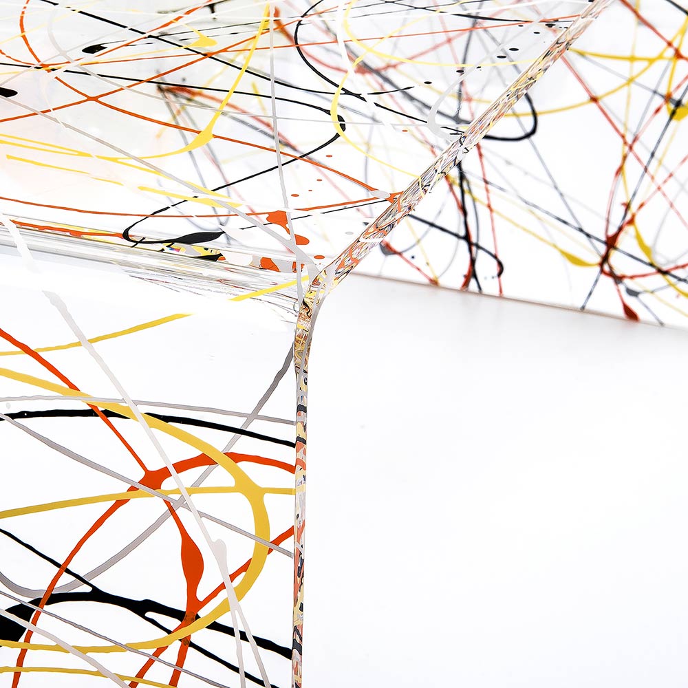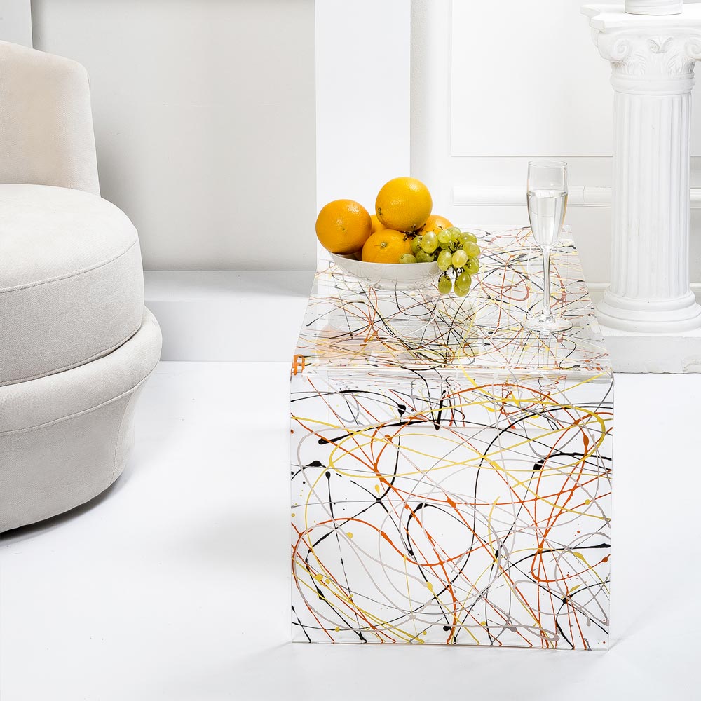 Tavolino da salotto pensato, progettato e realizzato in Italia attraverso l'uso di materiali innovativi e di qualità come il plexiglass trasparente con decori multicolor il quale risulta ideale in quanto atossico, ipoallergenico, inodore, antibatterico e 100% riciclabile. Questo tavolino è stato ideato per arredare con gusto e funzionalità il soggiorno o la zona notte fungendo da elemento d'arredo moderno, semplice e versatile.