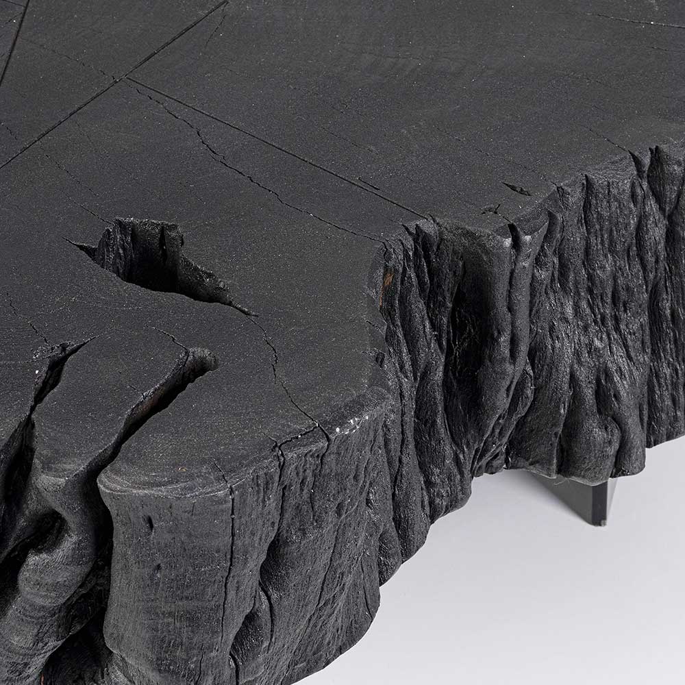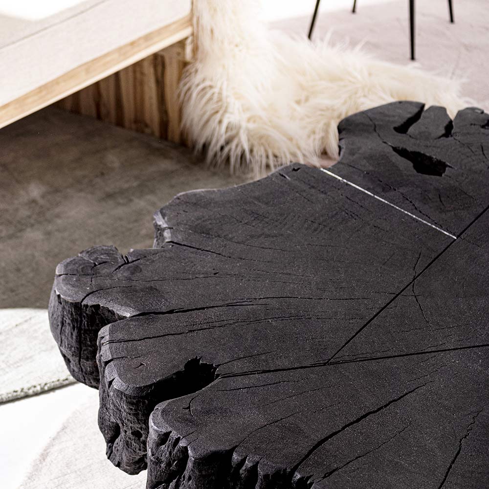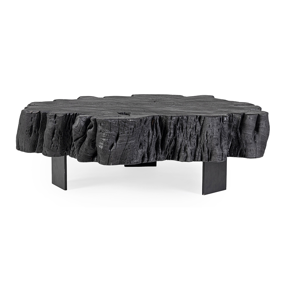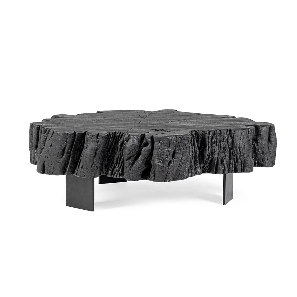 Tavolino basso per il salotto in acciaio e tronco di legno di acacia nero.