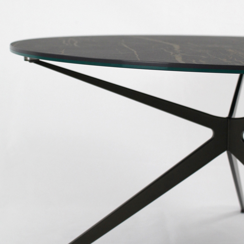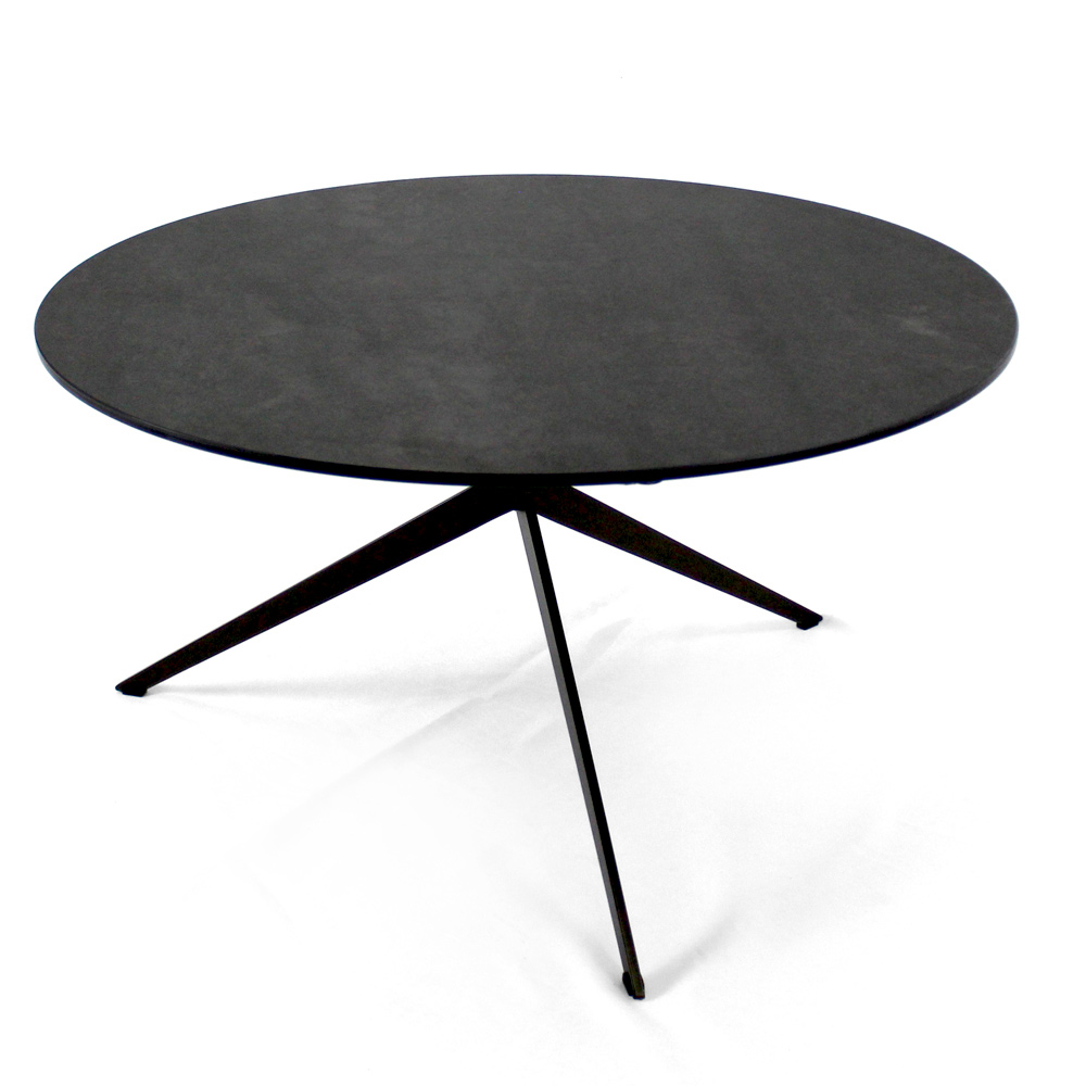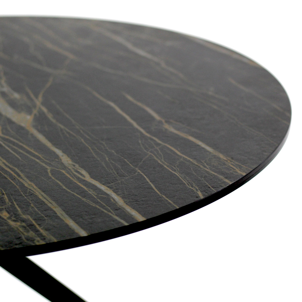 Tavolino rotondo con basamento in acciaio verniciato e piano in grès porcellanato.