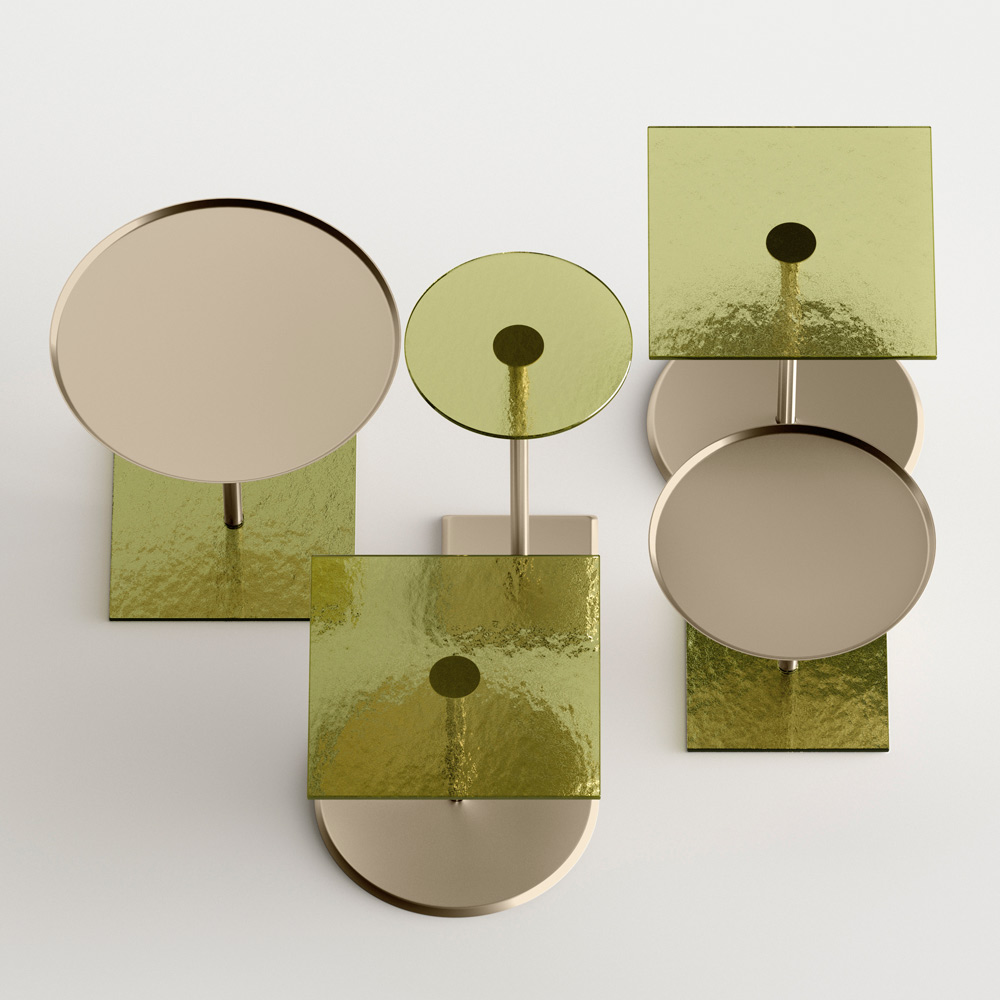 - piano in metallo champagne e base in vetro fuso verde salvia