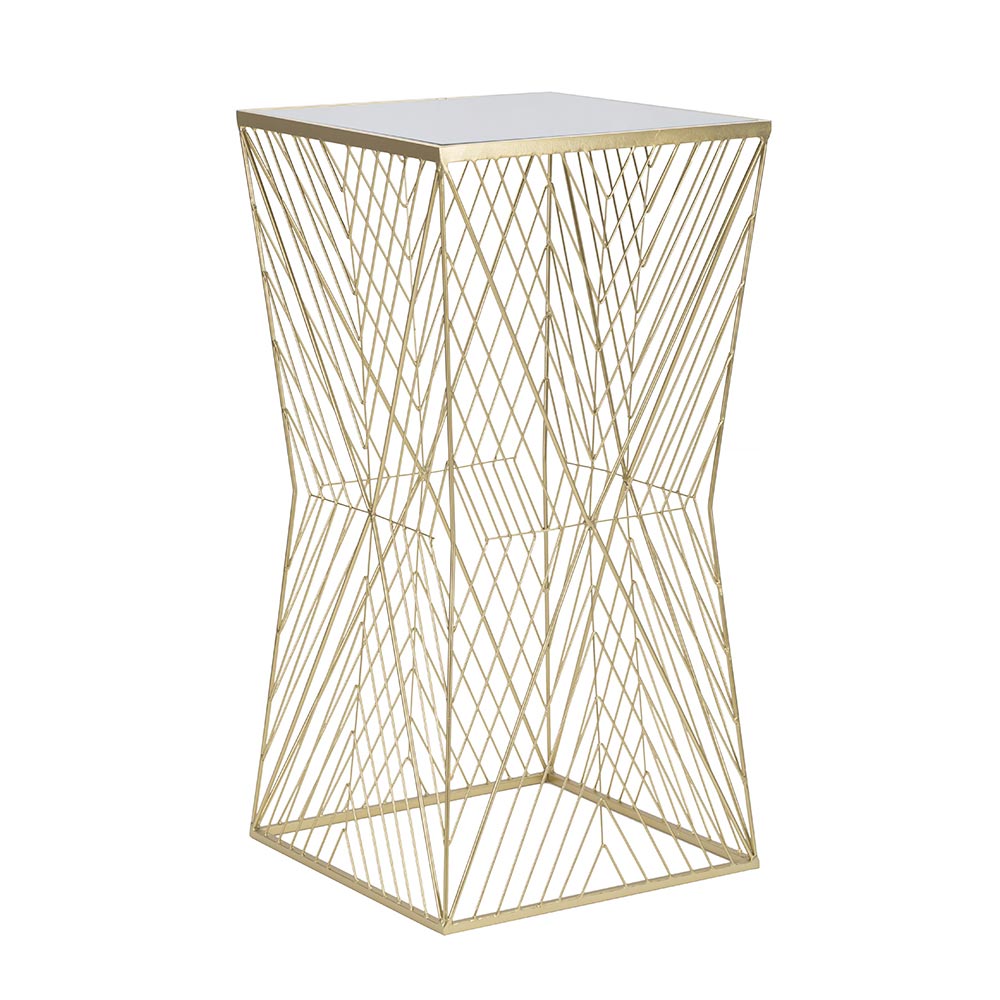 Questo tavolino unisce il calore del design moderno alla funzionalità desiderata in ogni abitazione. La sua base è un intrico geometrico di linee in ferro dorato, che si intersecano creando un effetto quasi ipnotico, una scultura che sostiene un sobrio piano d'appoggio. La silhouette aperta non appesantisce lo spazio, ma aggiunge piuttosto un elemento di leggera eleganza.