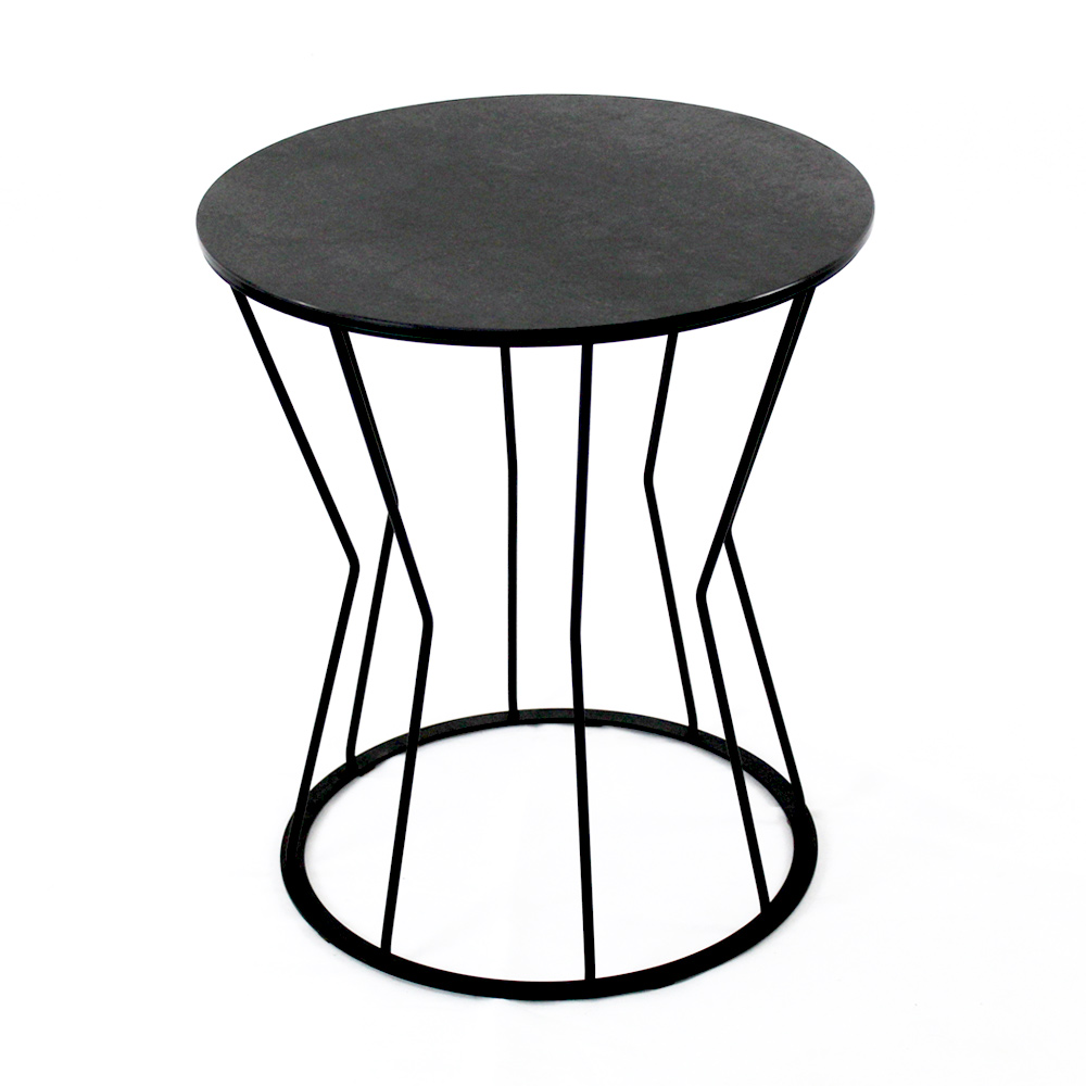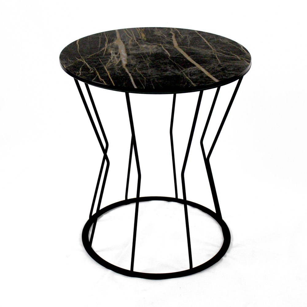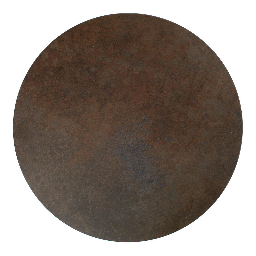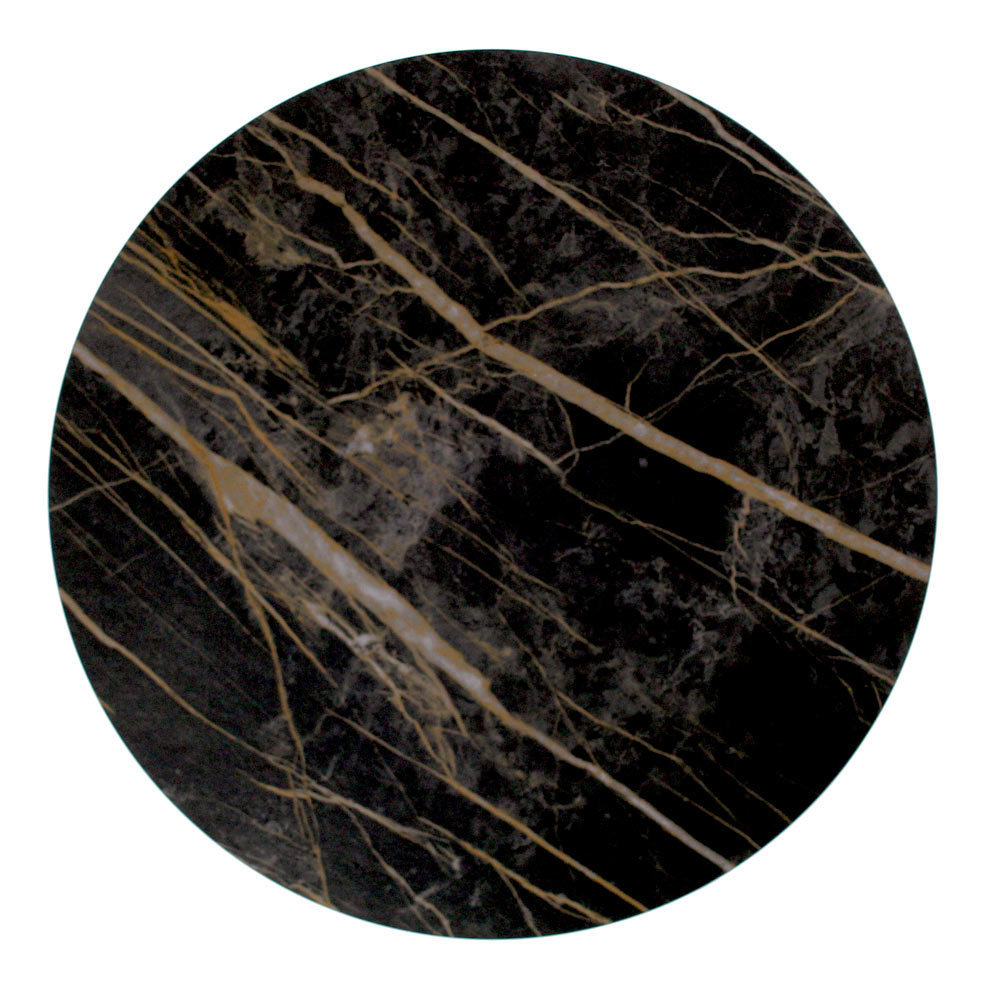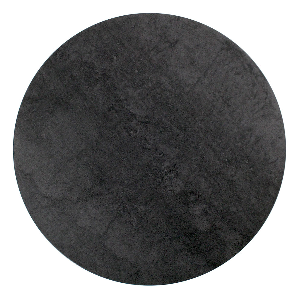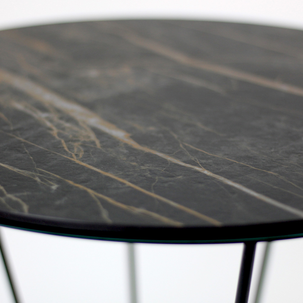 Tavolino rotondo con basamento in acciaio verniciato e piano in grès porcellanato.