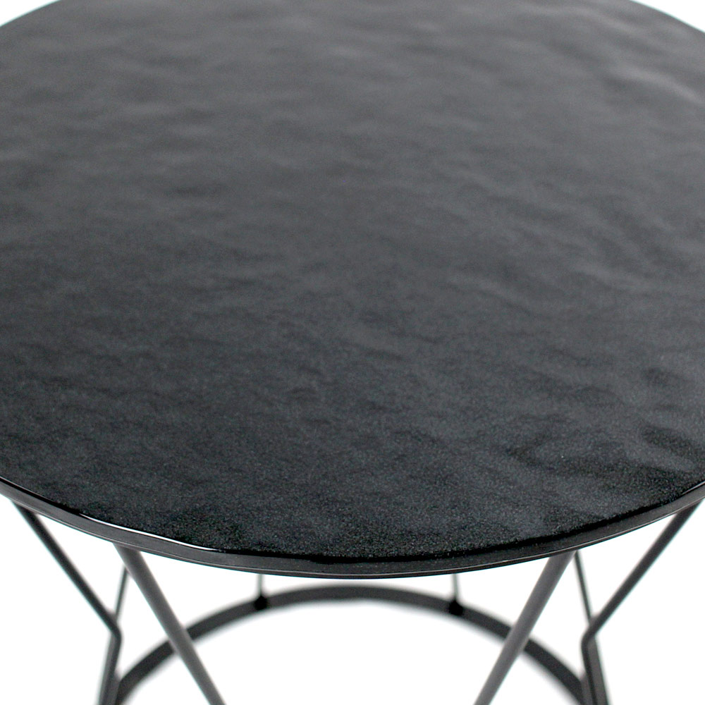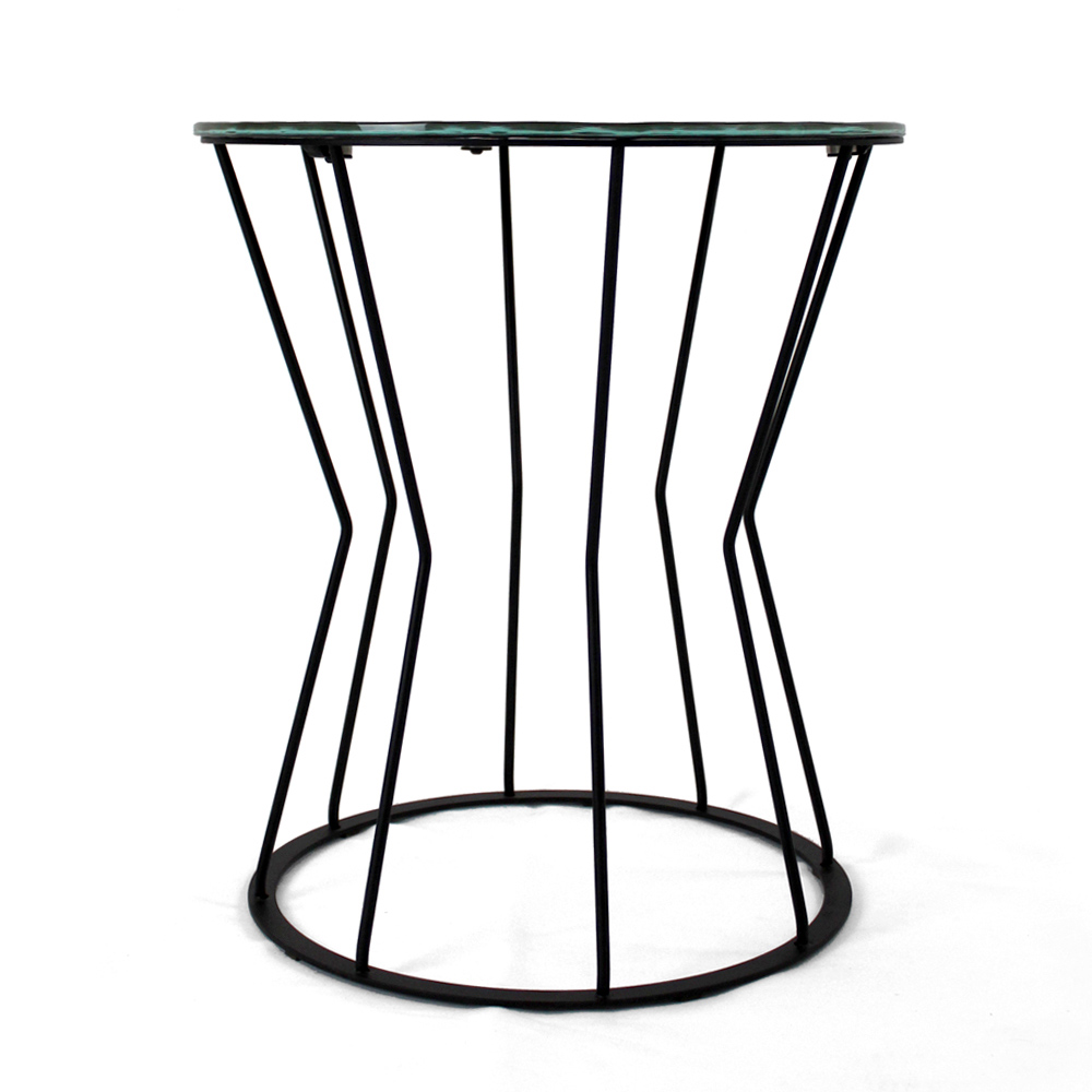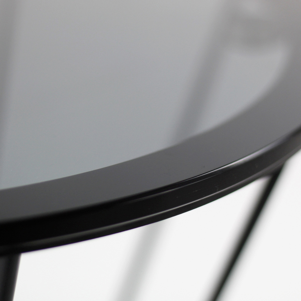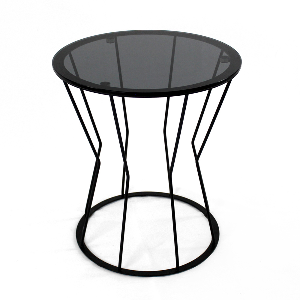 Tavolino rotondo con basamento in acciaio verniciato e piano in vetro.