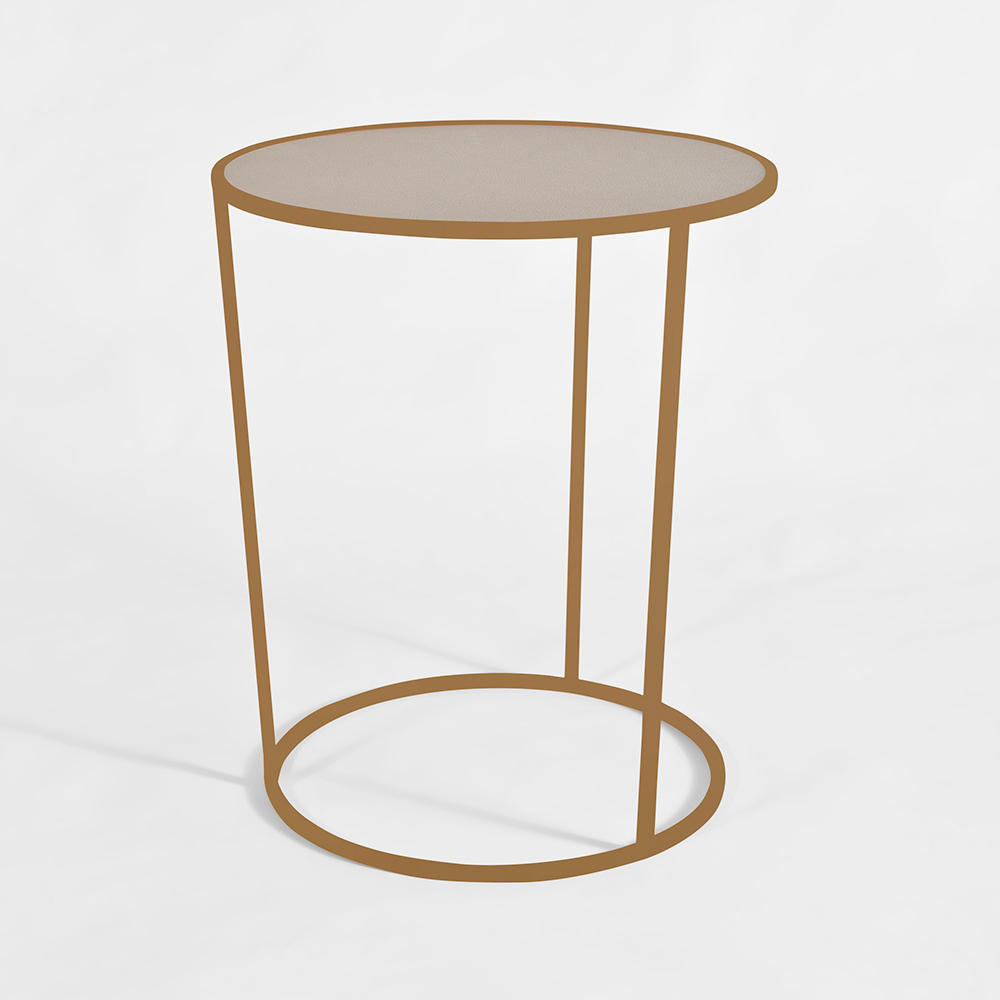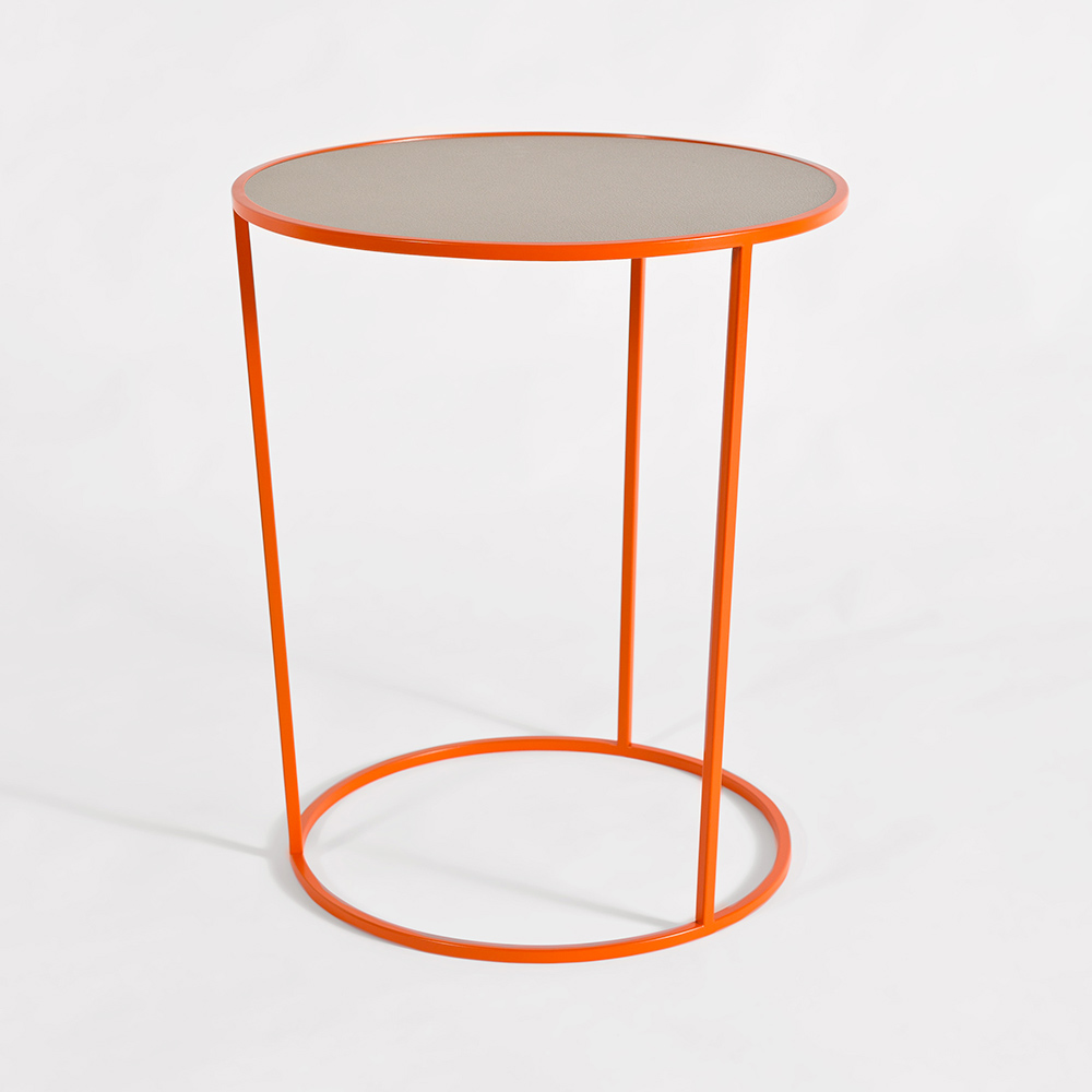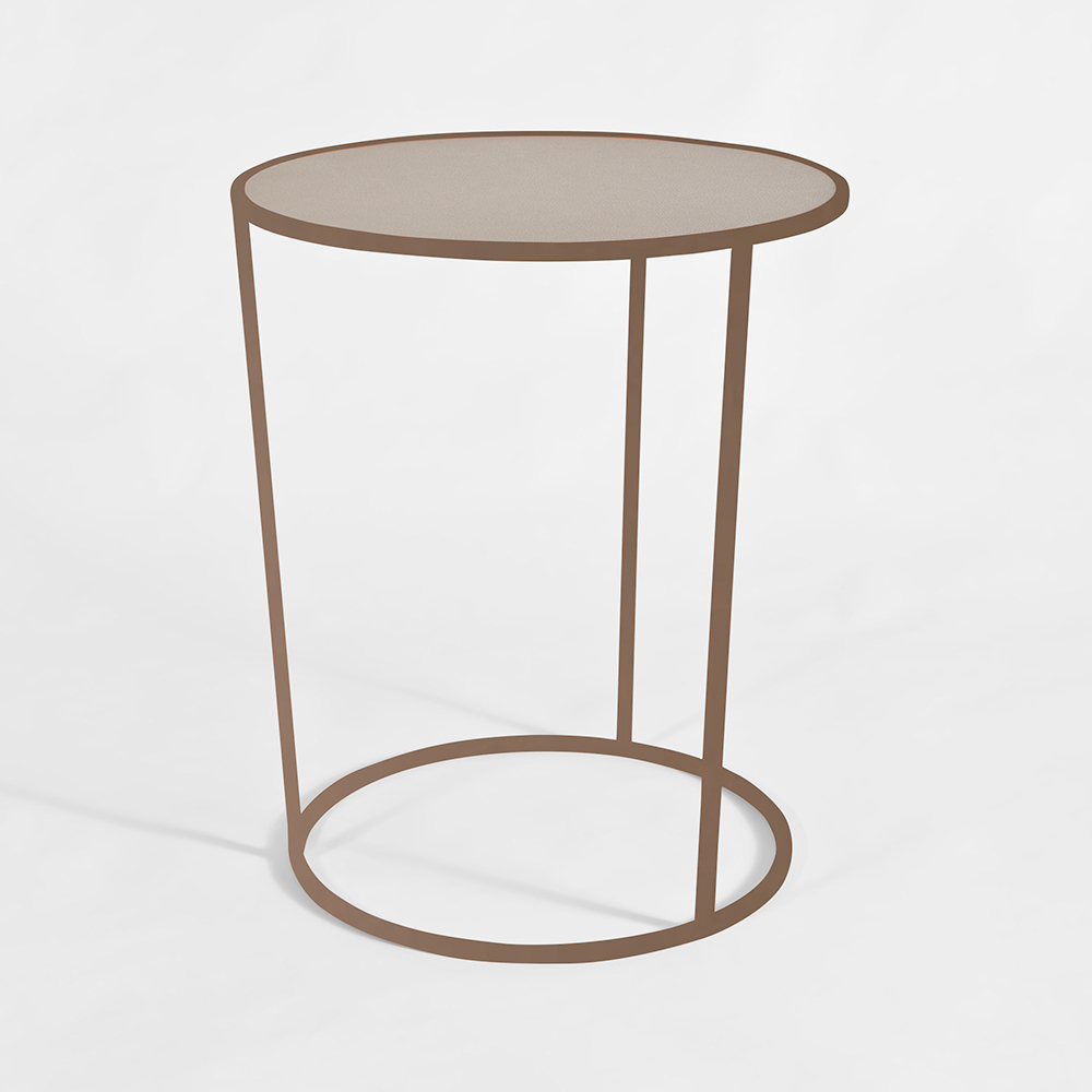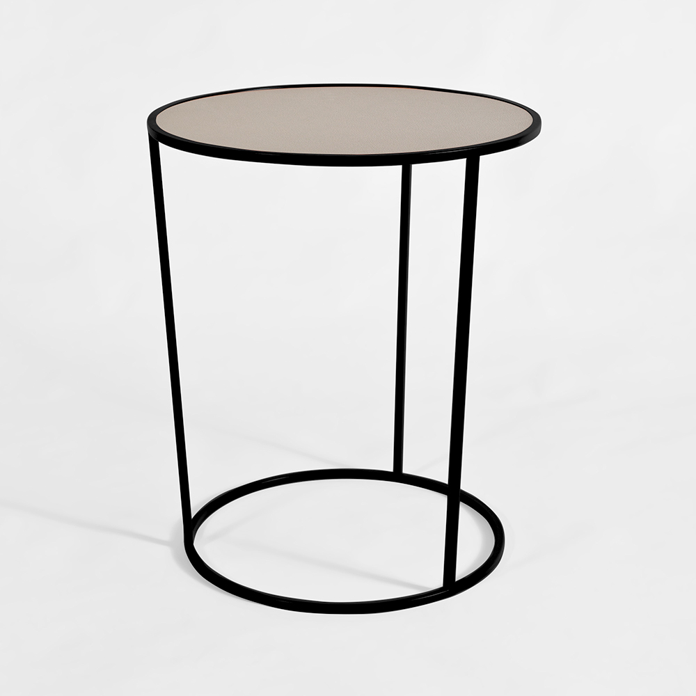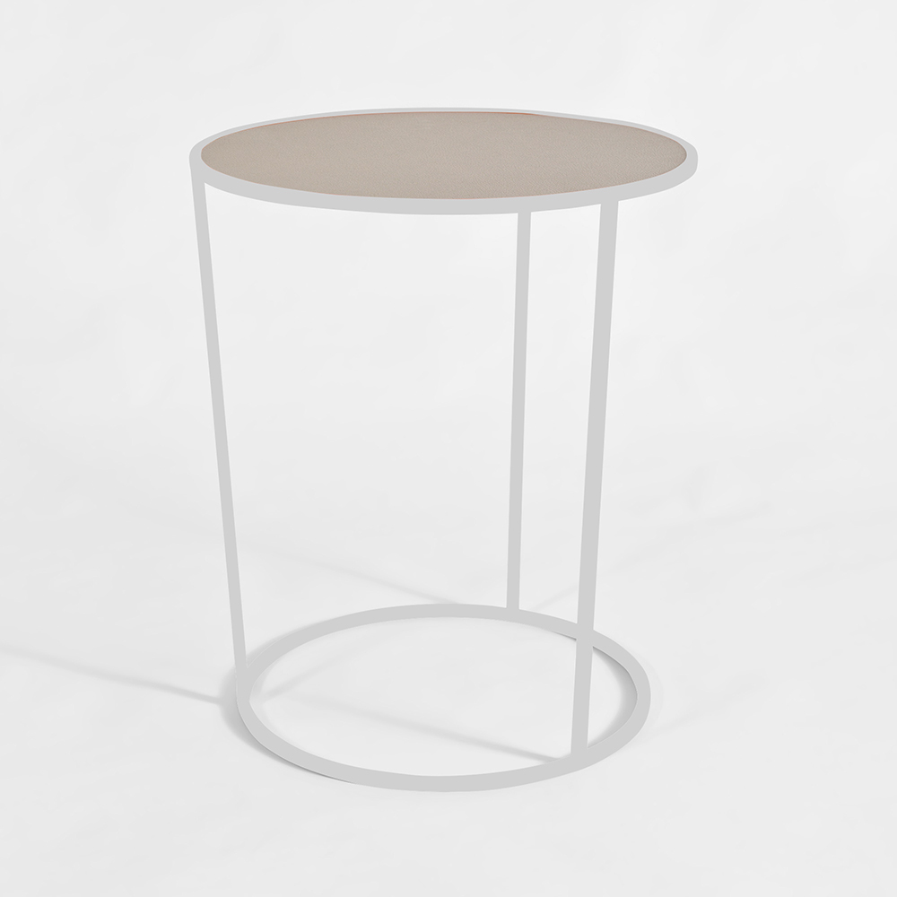 tavolino rotondo dalle linee minimali e dal pratico utilizzo presenta un top in melaminico pelle fiore. Il