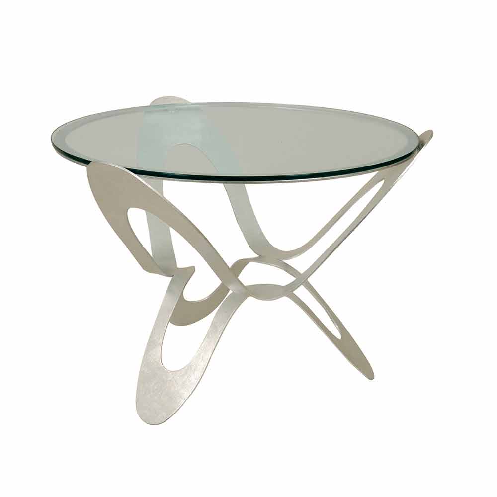 Tavolino basso da salotto rotondo prodotto in Italia artigianalmente in vetro e ferro foglia oro o argento.