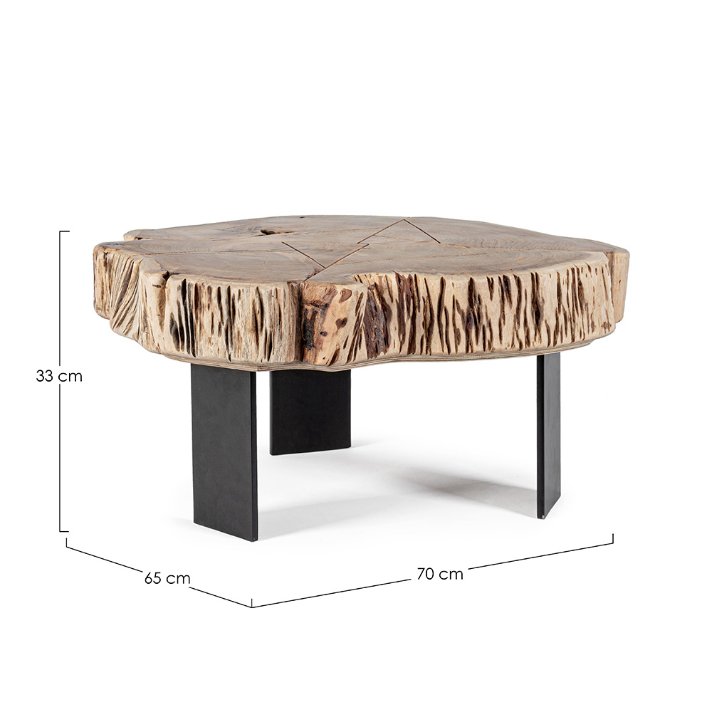 Tavolino basso per il salotto in acciaio e tronco di legno di acacia naturale.