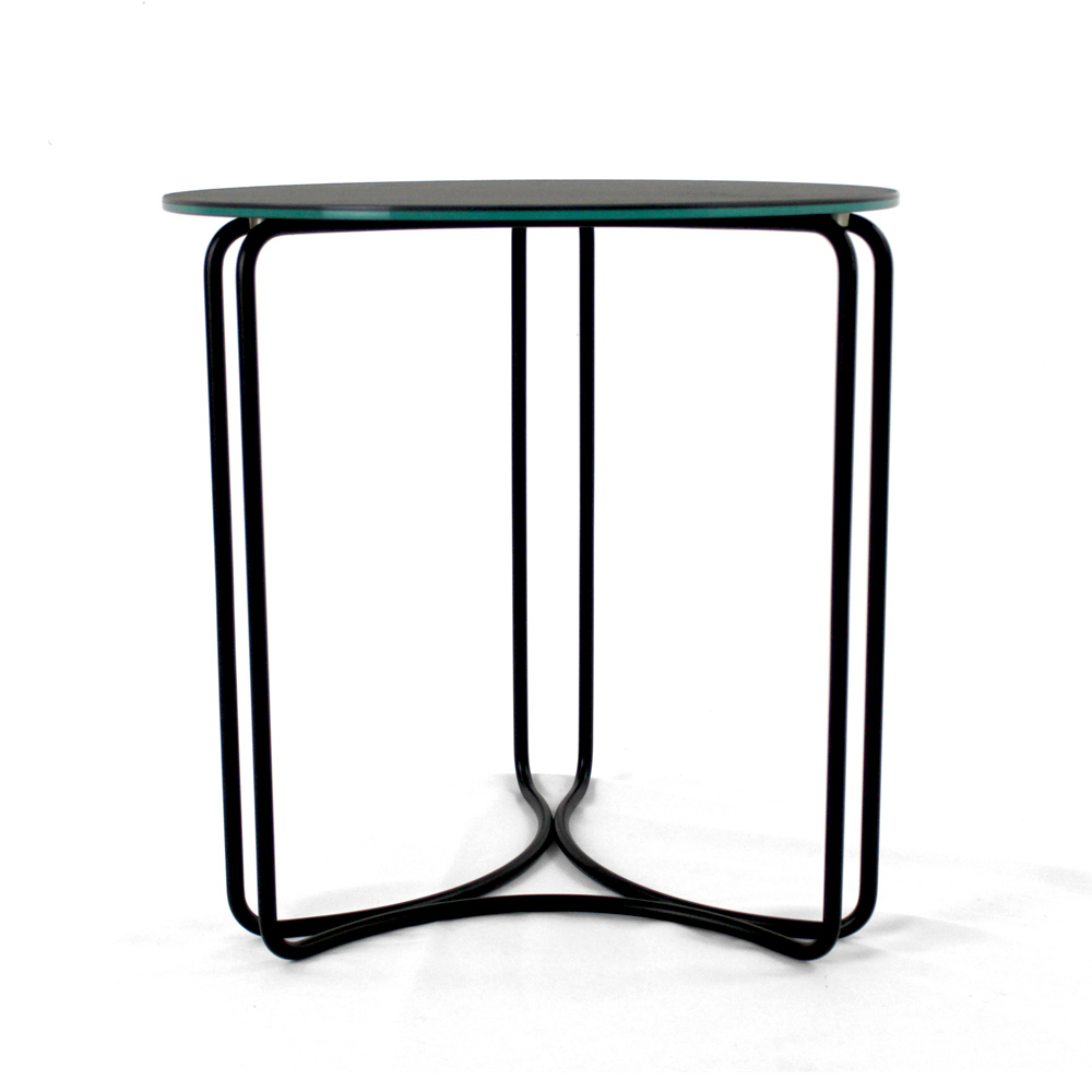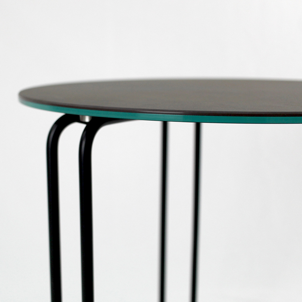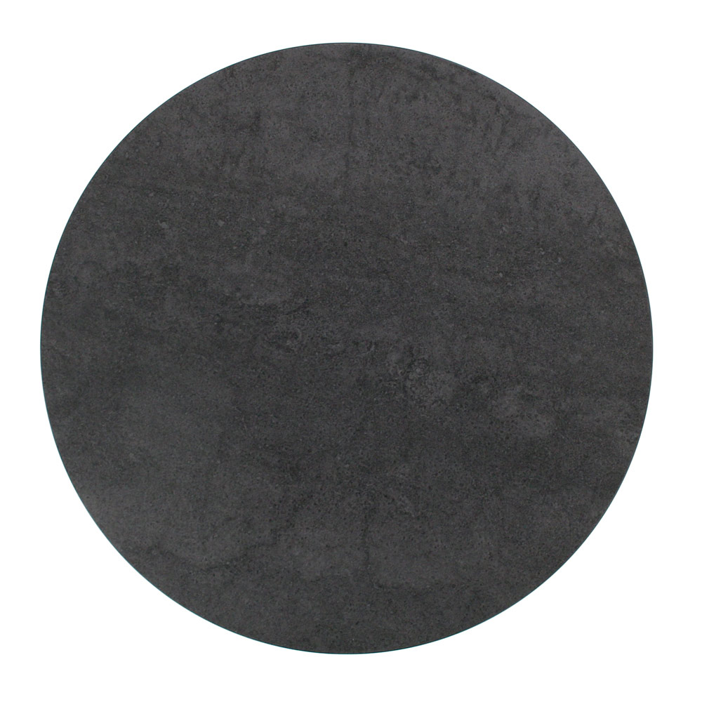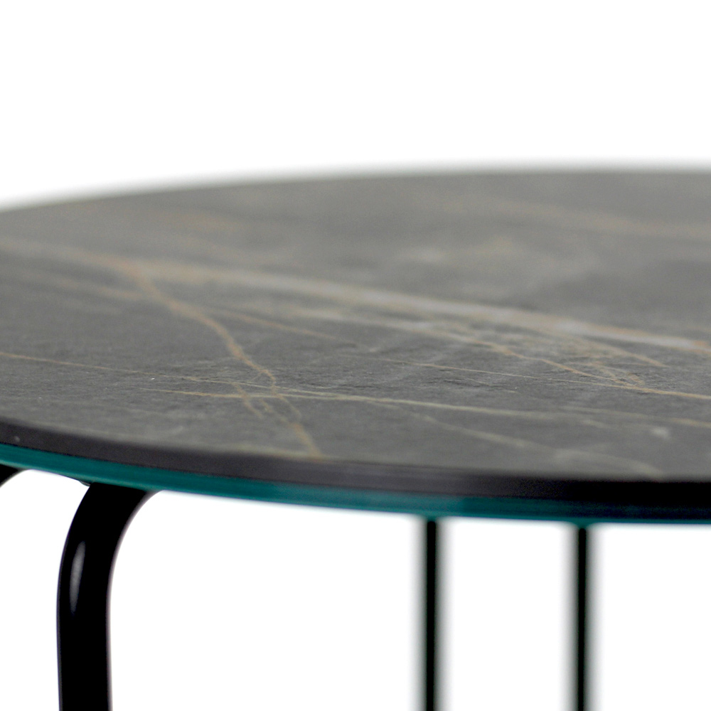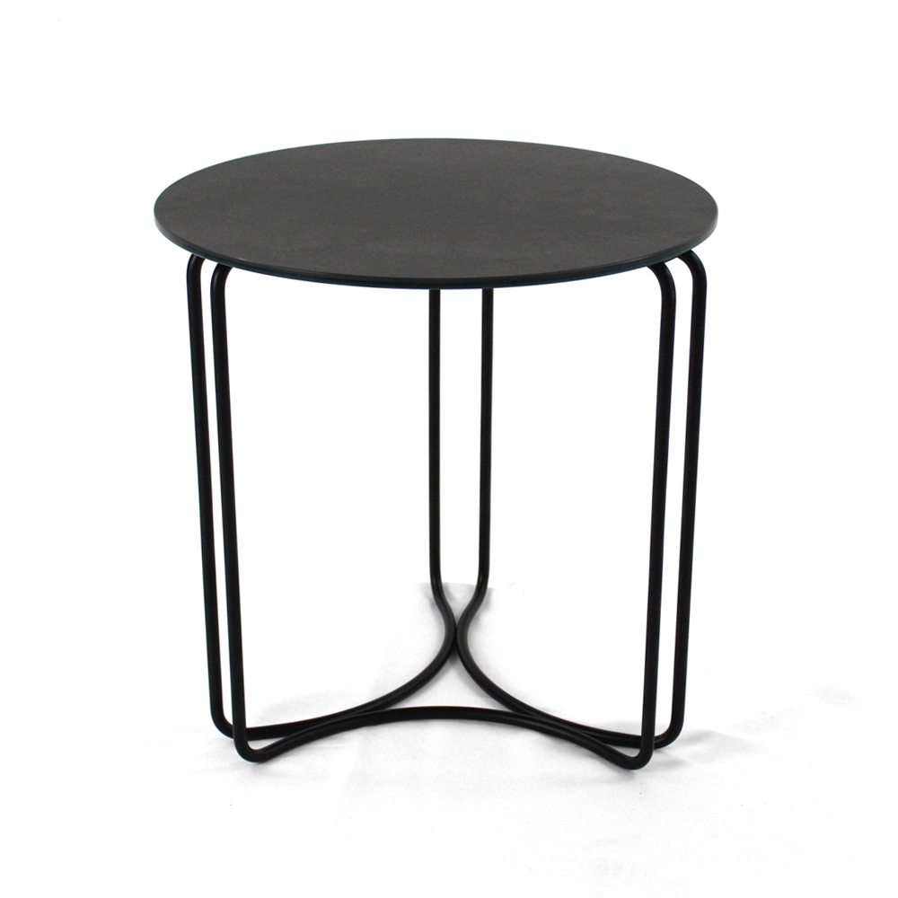 Tavolino rotondo con basamento in acciaio verniciato e piano in grès porcellanato.