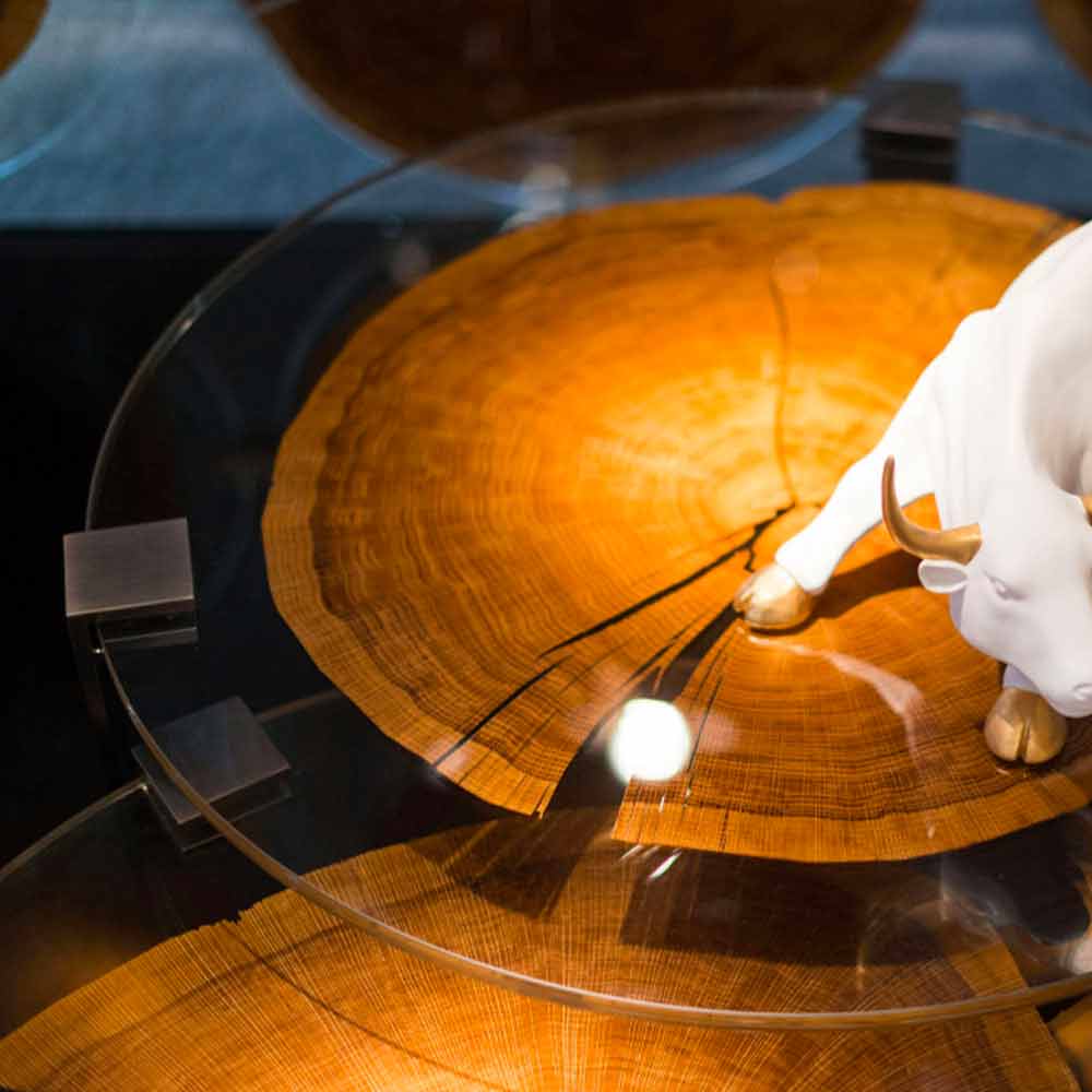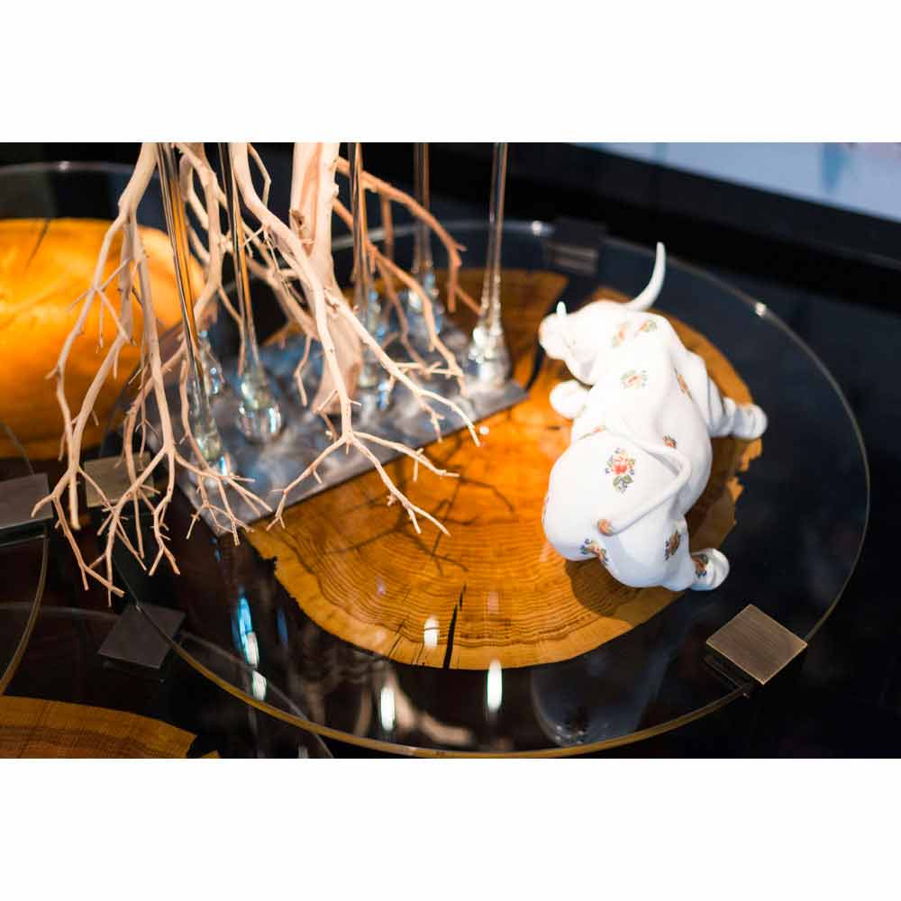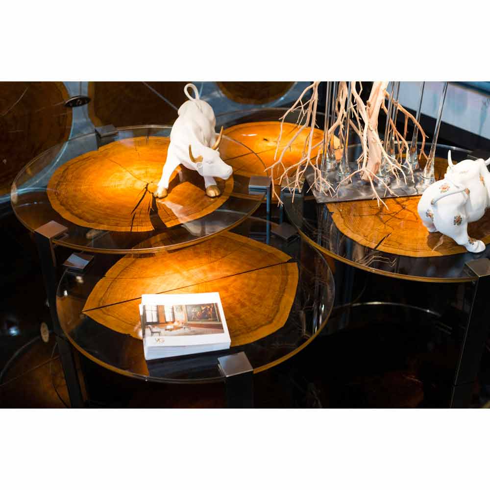 Tavolino da salotto realizzato in Italia con piano rotondo in vetro accoppiato (5+5 mm) al cui interno viene inserita una sottile sezione di legno tranciato di testa sostenuto da 3 gambe in metallo finitura ottone brunito. Dall'esclusiva combinazione tra il tocco raffinato del vetro, i meravigliosi colori del legno e l'estetica moderna del metallo nasce una soluzione d'arredo unica che basa la sua idea su concetti di innovazione ed eleganza per un risultato all'avanguardia e dalla forte personalità contemporanea. Il suo punto di forza è rappresentato proprio dal perfetto connubio di finiture e materiali che accrescono il pregio del tavolino senza mai tralasciare il fondamentale aspetto funzionale sottolineato dalla lavorazione 100% Made in Italy e dall'utilizzo di materie prime di qualità permettendo così di offrire un complemento d'arredo dalla bellezza rivoluzionaria e al tempo stesso particolarmente solido e resistente.