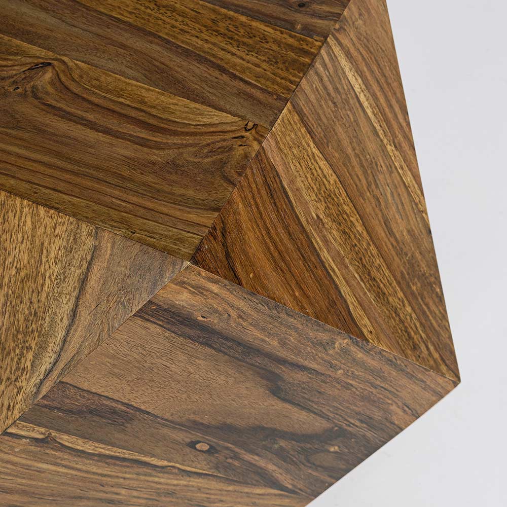Questo tavolino da soggiorno dal design poligonale è interamente realizzato in pregiato legno sheesham con finitura a base di vernice poliuretanica.