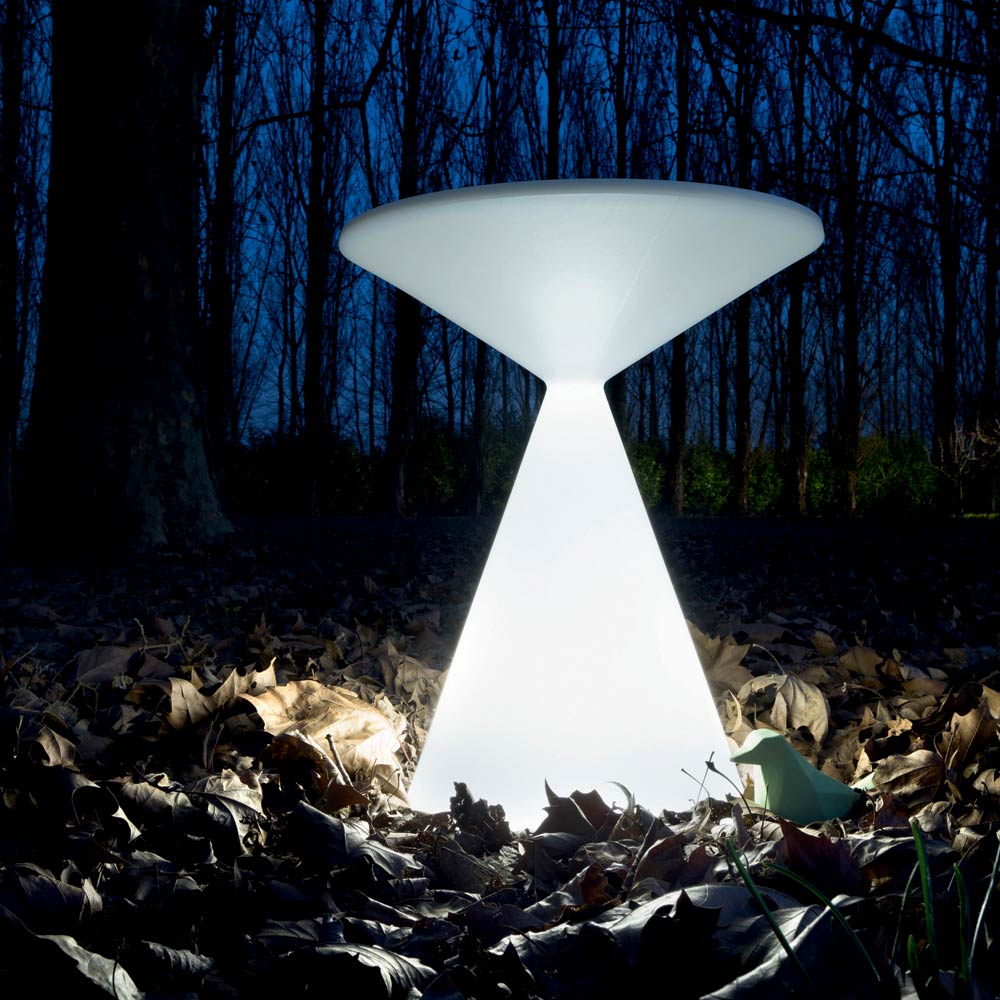 Tavolino tondo luminoso per esterni in polietilene e contenitore interno made in Italy.