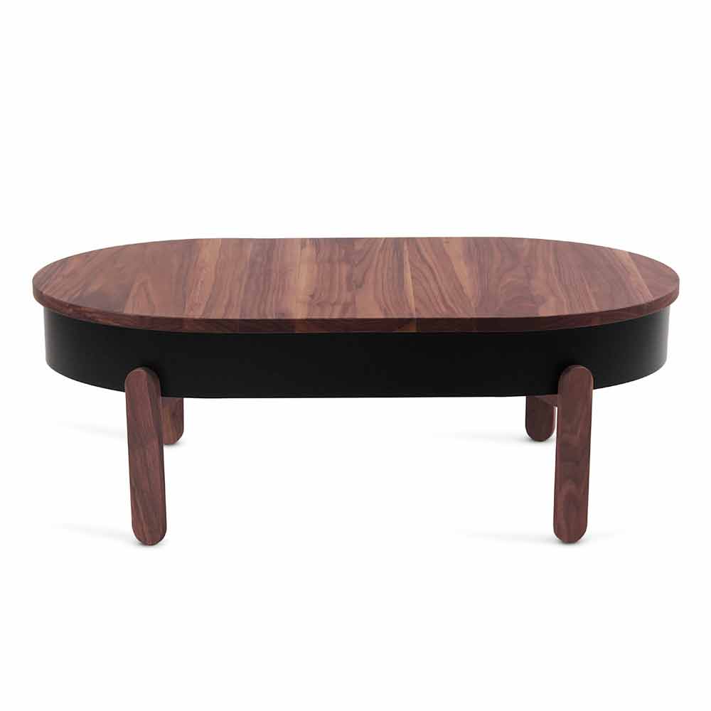 Tavolino da salotto moderno realizzato in rovere massello e acciaio laccato.