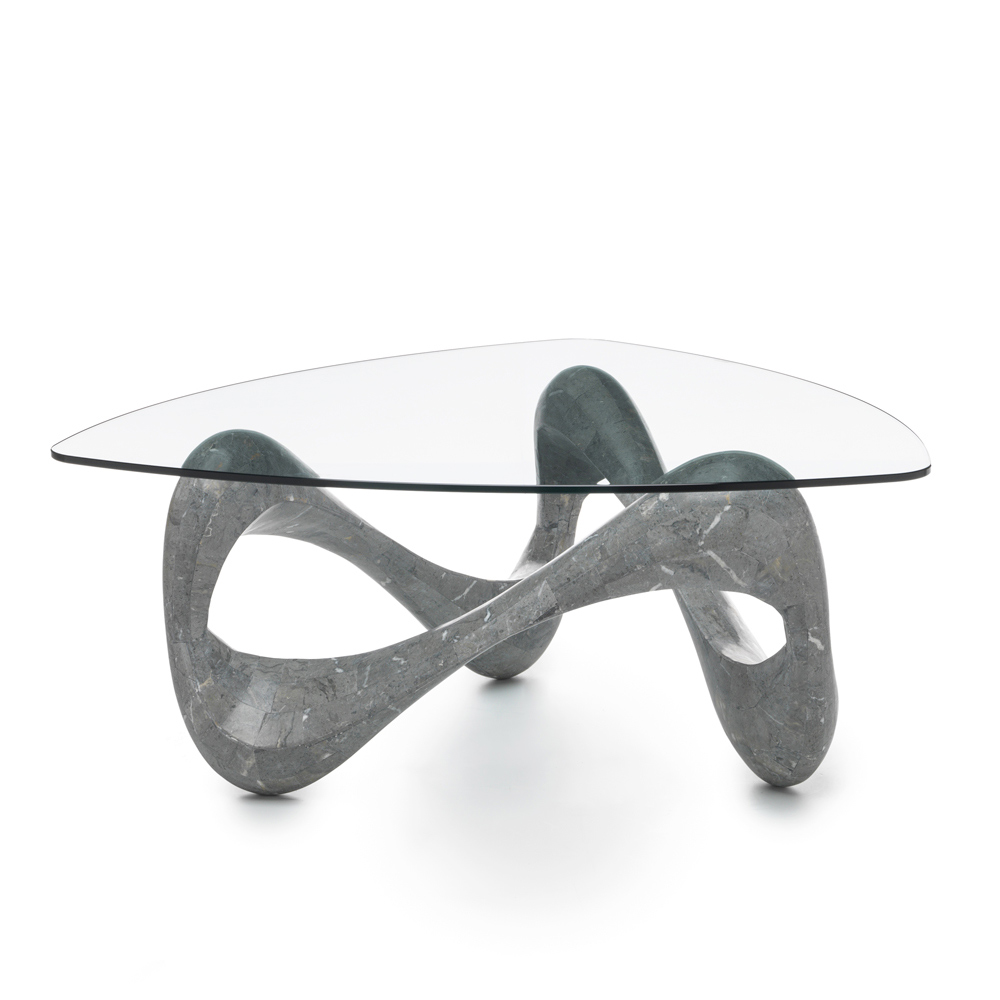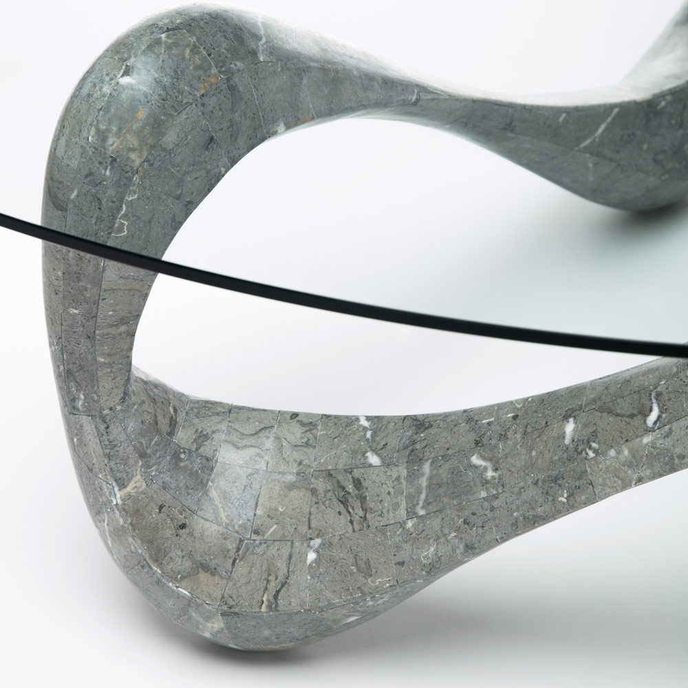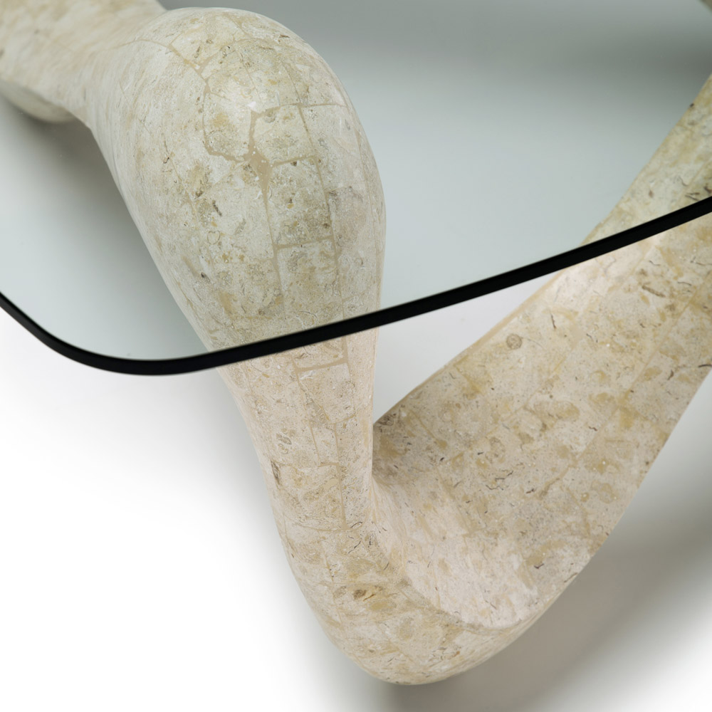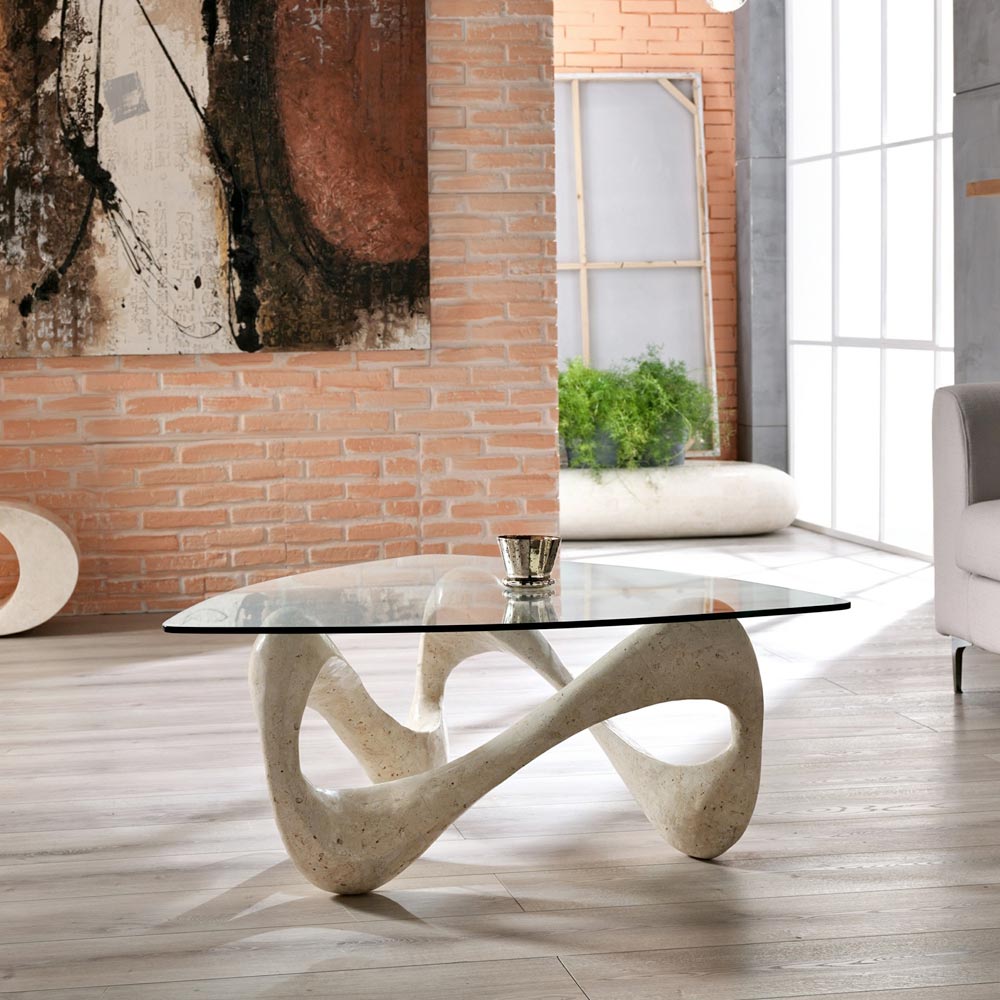 Tavolino da Salotto con Piano in Vetro e Base in Pietra Fossile - California