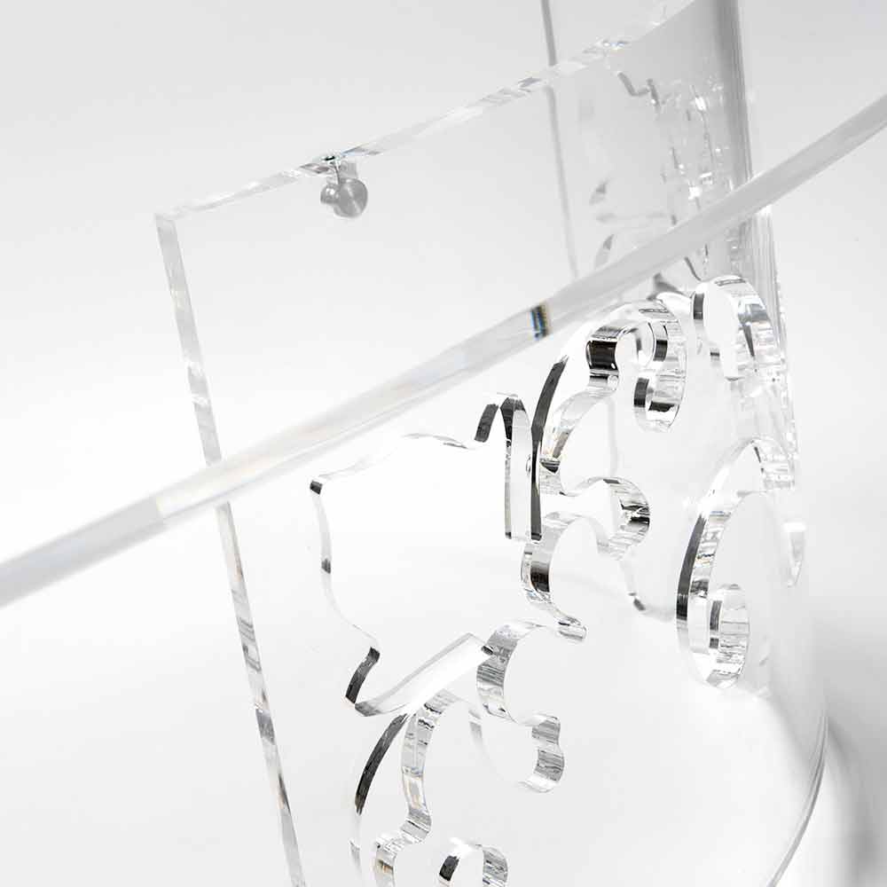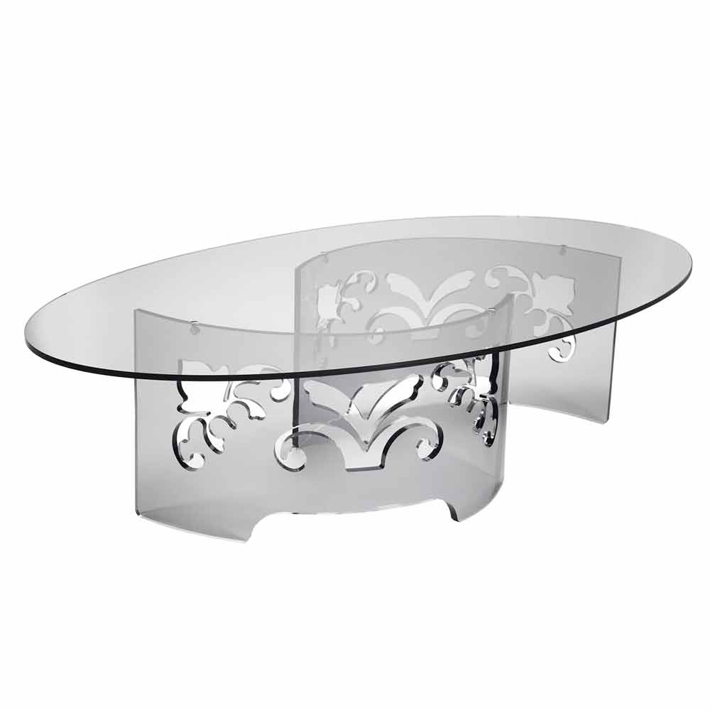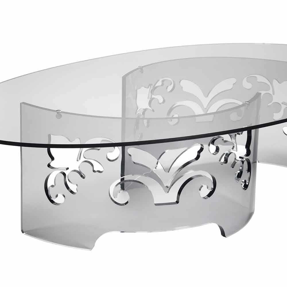Tavolino da salotto ovale in plexiglass trasparente o fumè con base decorata intagliata a laser made in Italy.
