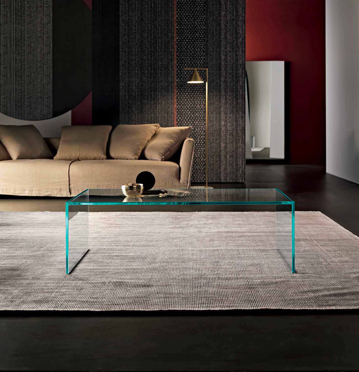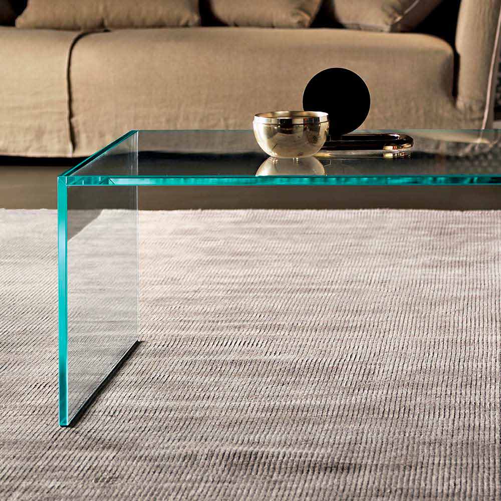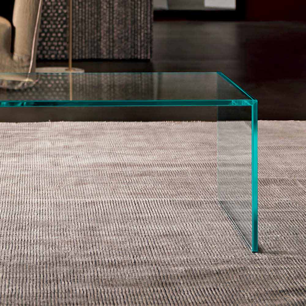 Tavolino da salotto rettangolare di design moderno in vetro extrachiaro, prodotto artigianalmente in Italia.