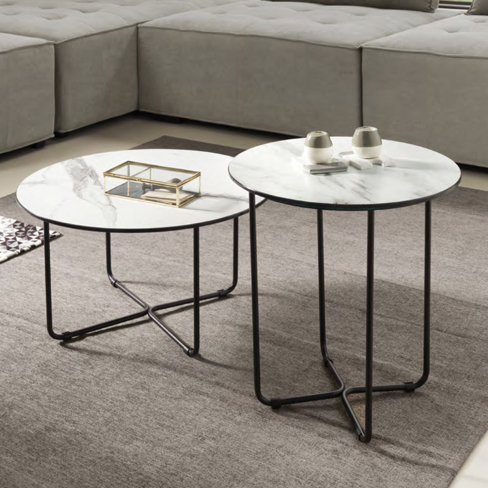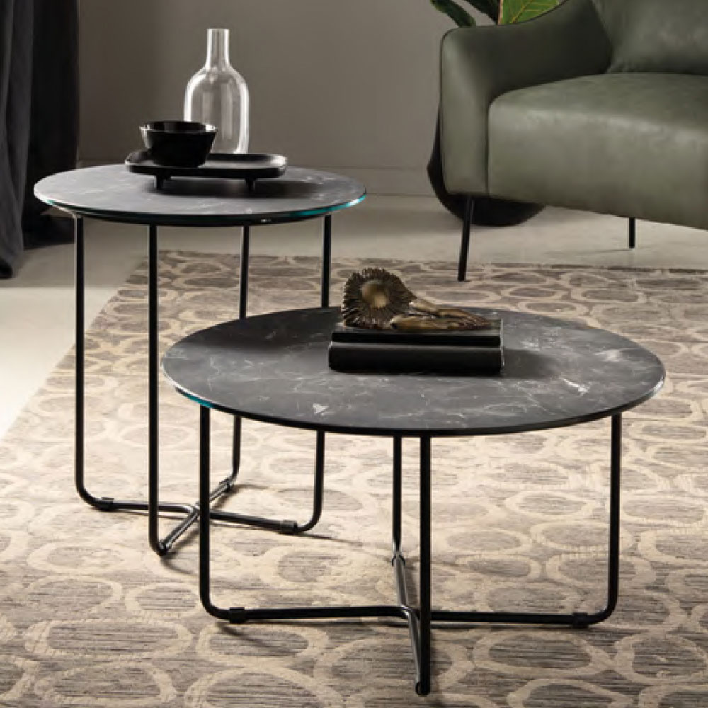 Tavolino da salotto con piano rotondo in vetro effetto marmo Made in Italy.