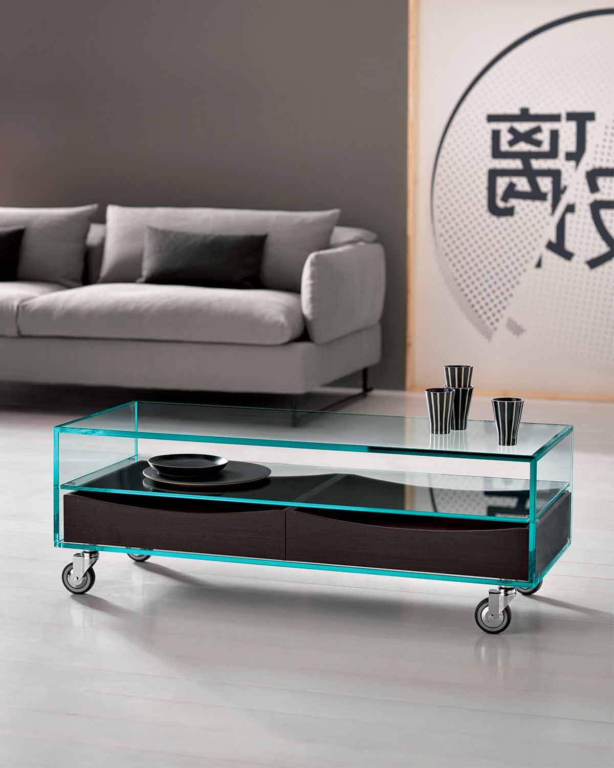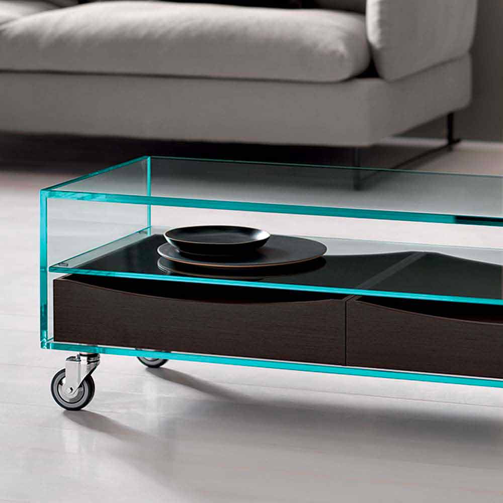 Tavolino da salotto in stile moderno su ruote in vetro extrachiaro con due cassetti in legno wengè, made in Italy.