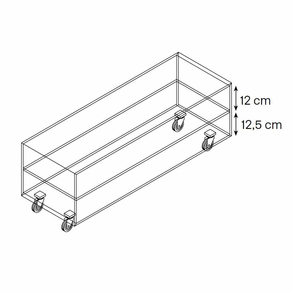 Realizzato con una struttura su ruote in vetro extrachiaro con ripiano portaoggetti e due cassetti contenitori in legno wengè.