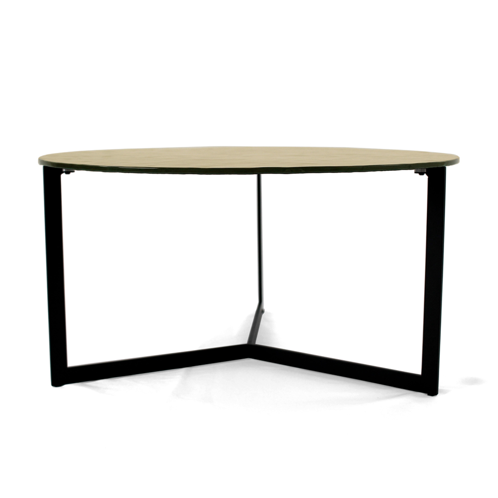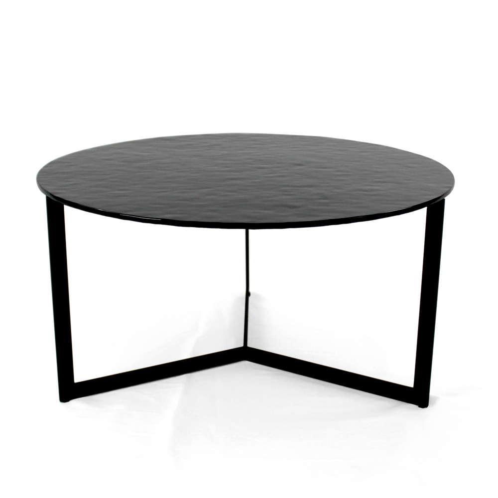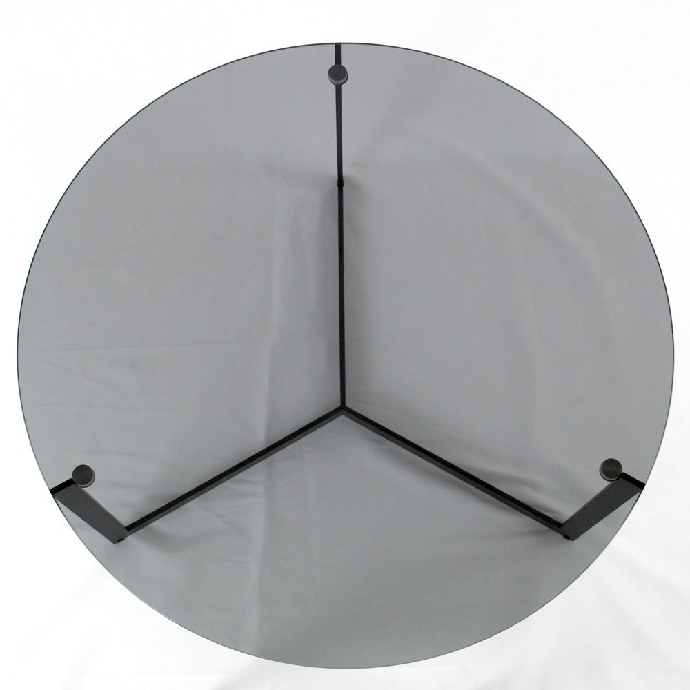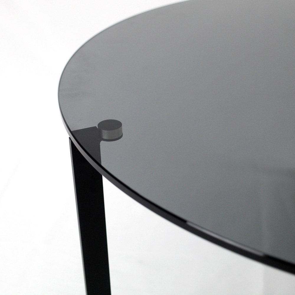 Tavolino rotondo con basamento in acciaio verniciato e piano in vetro.