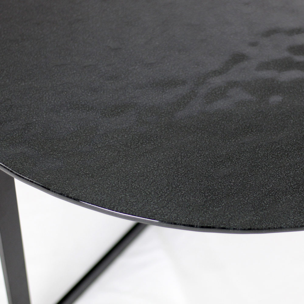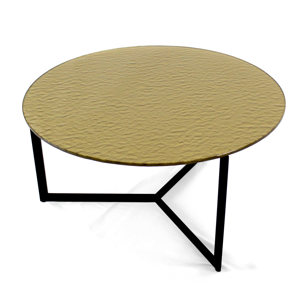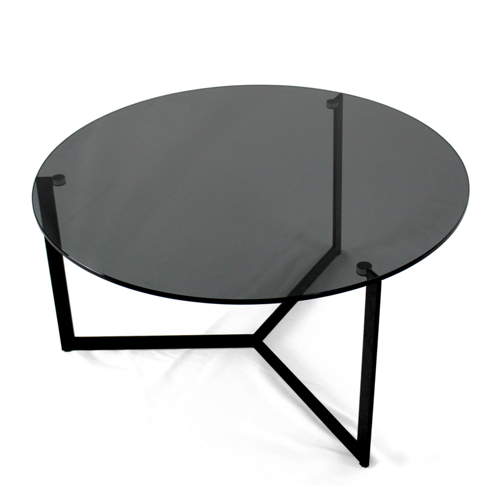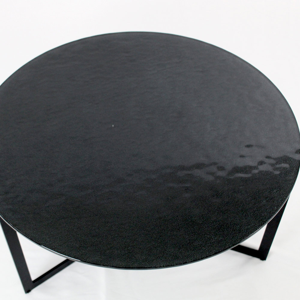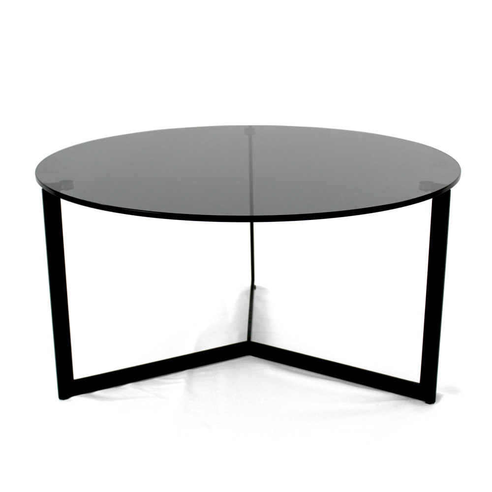 Tavolino rotondo con basamento in acciaio verniciato e piano in vetro.