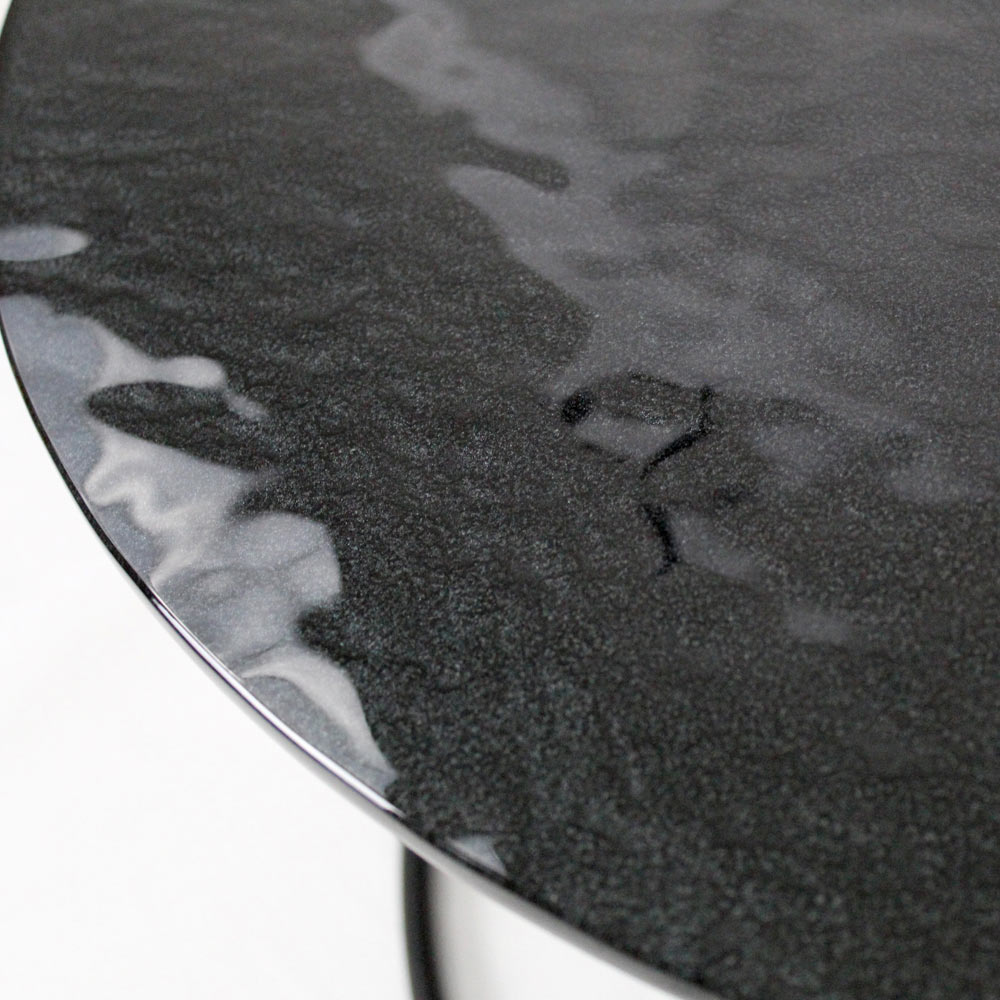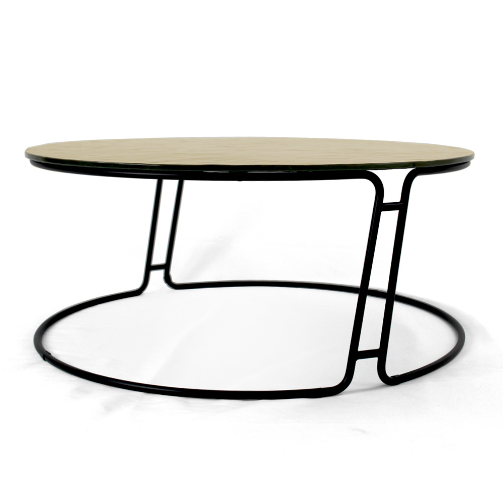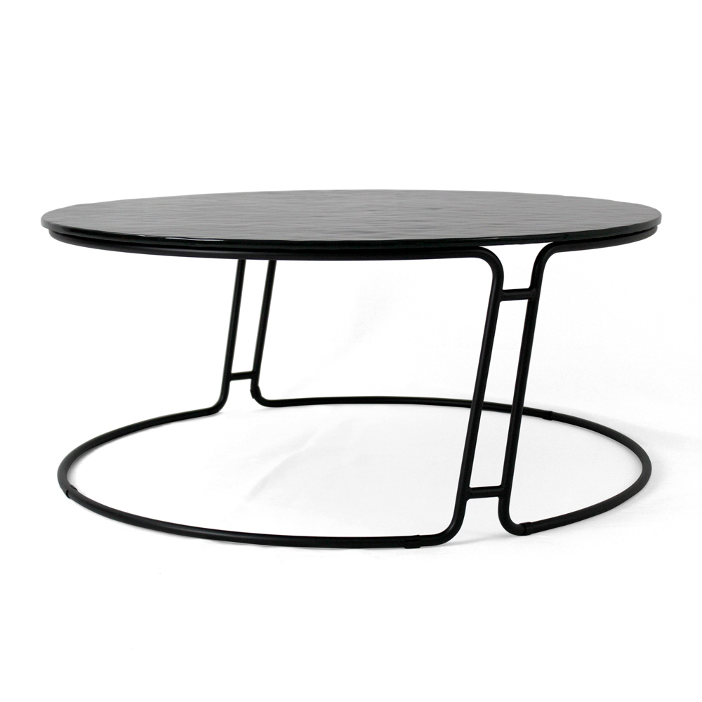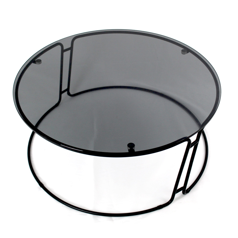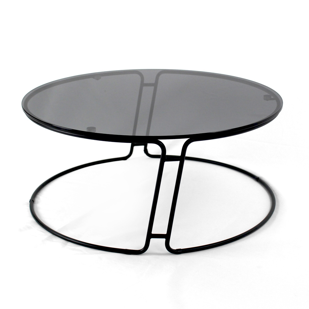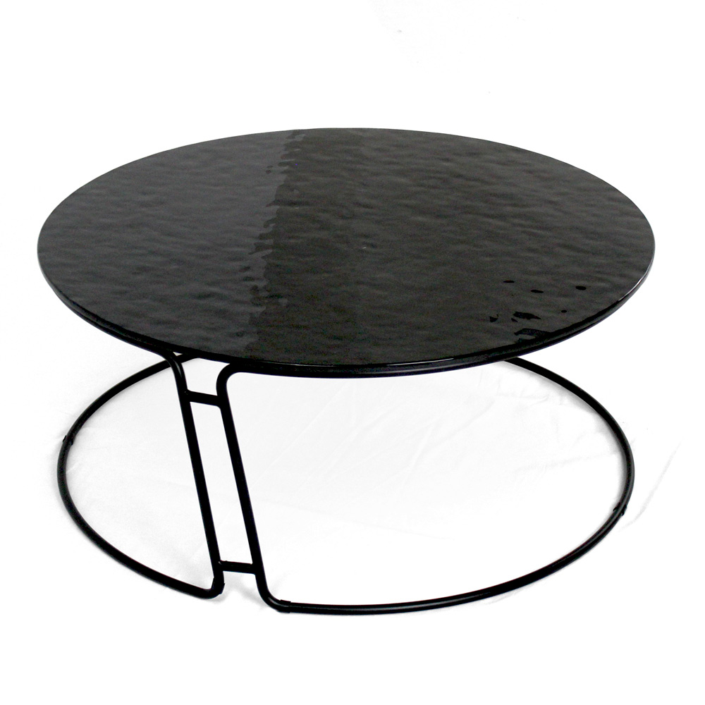 Tavolino rotondo con basamento in acciaio verniciato e piano in vetro.