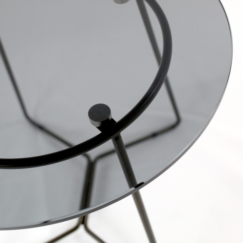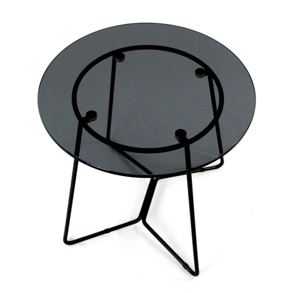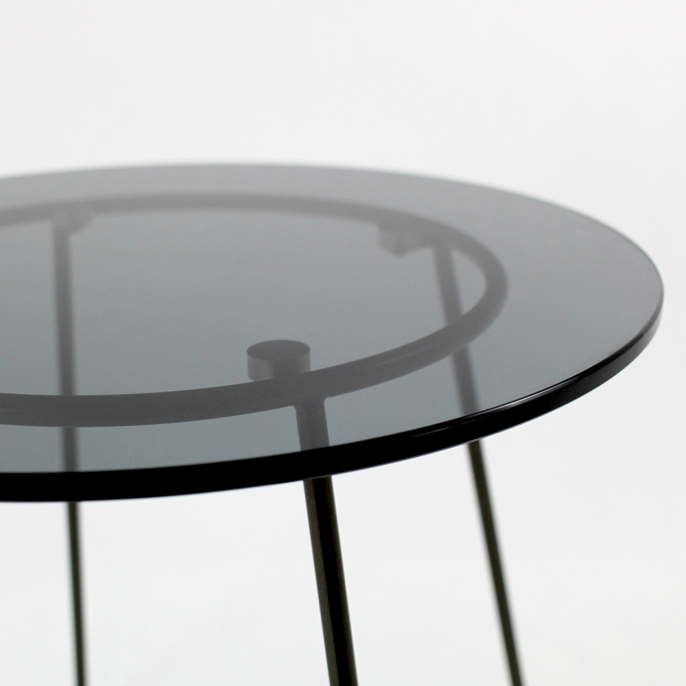 Tavolino rotondo con basamento in acciaio verniciato e piano in vetro.