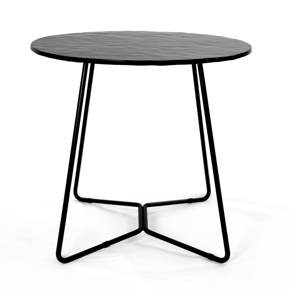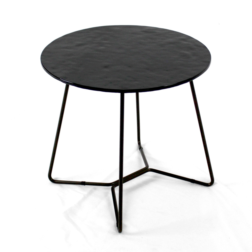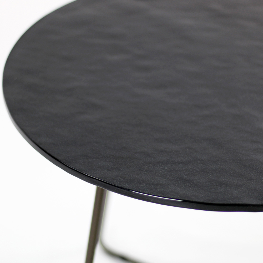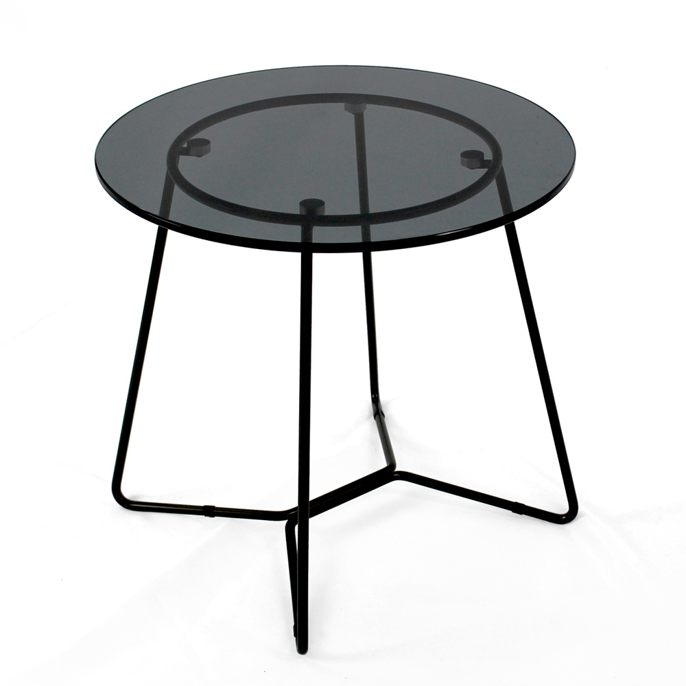 Tavolino rotondo con basamento in acciaio verniciato e piano in vetro.