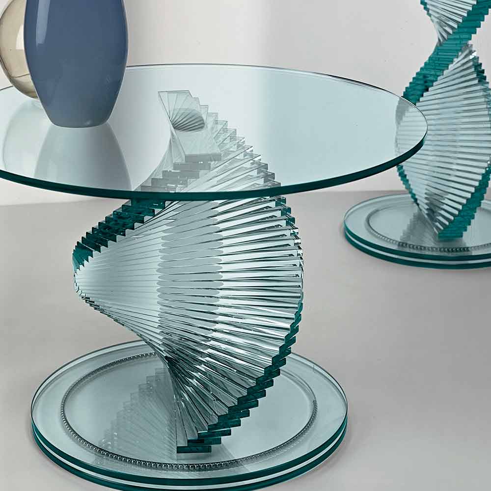 Composto da una colonna centrale di listelli di cristallo sovrapposti a spirale, la base rotante presenta un sistema brevettato di sfere in acciaio che consentono alle fondamenta di ruotare, accentuando così il movimento ad elica della colonna.