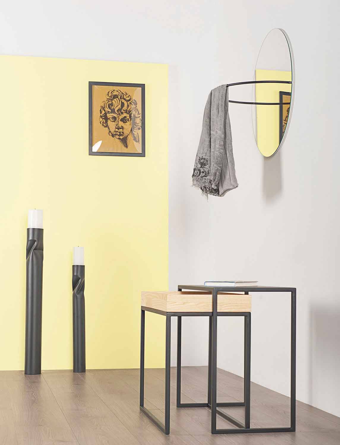 Tavolino da salotto di design in acciaio con vassoio removibile in frassino Made in Italy.