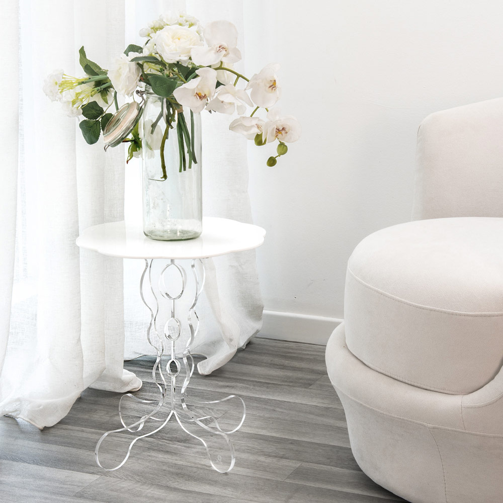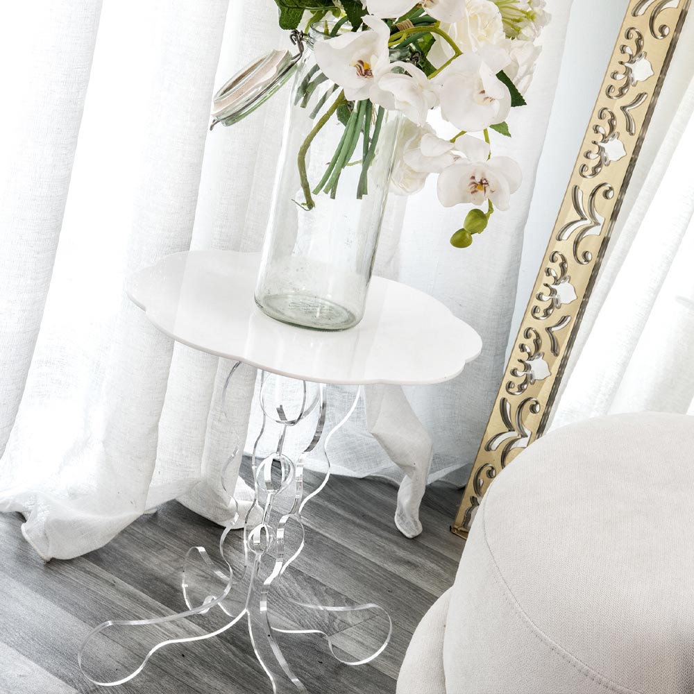 Richiami moreschi per il tavolino Janis bianco: la base in plexiglass PMMA 100% da polimero vergine trasparente, sagomata al laser, dona discrezione, mentre il ripiano bianco in pigmento pieno conferisce un tocco di colore all' ambiente domestico. Il plexiglass è antiurto, indeformabile, inalterabile e termoisolante. La luminosità e la brillantezza si mantengono costanti ed inalterati nel tempo. Il plexiglass PMMA da polimero vergine utilizzato è atossico, ipoallergico, inodore ed antibatterico. Pensato, progettato e realizzato in Italia, con materiali italiani.
