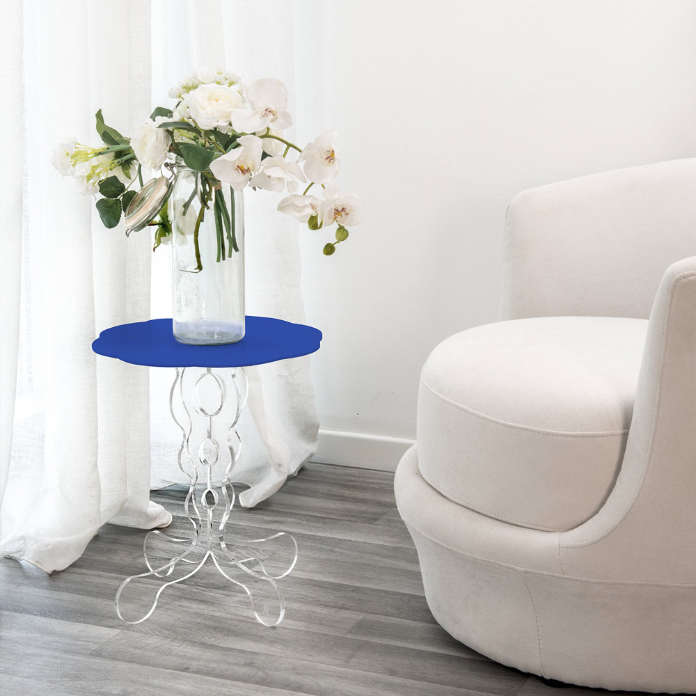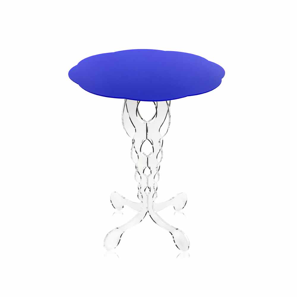 Richiami moreschi per il tavolino Janis blu: la base in plexiglass PMMA 100% da polimero vergine trasparente, sagomata al laser, dona discrezione, mentre il ripiano blu in pigmento pieno conferisce un tocco di colore all' ambiente domestico. Il plexiglass è antiurto, indeformabile, inalterabile e termoisolante. La luminosità e la brillantezza si mantengono costanti ed inalterati nel tempo. Il plexiglass PMMA da polimero vergine utilizzato è atossico, ipoallergico, inodore ed antibatterico. Pensato, progettato e realizzato in Italia, con materiali italiani.