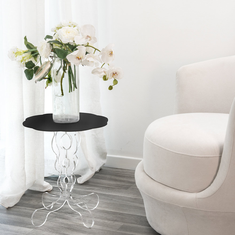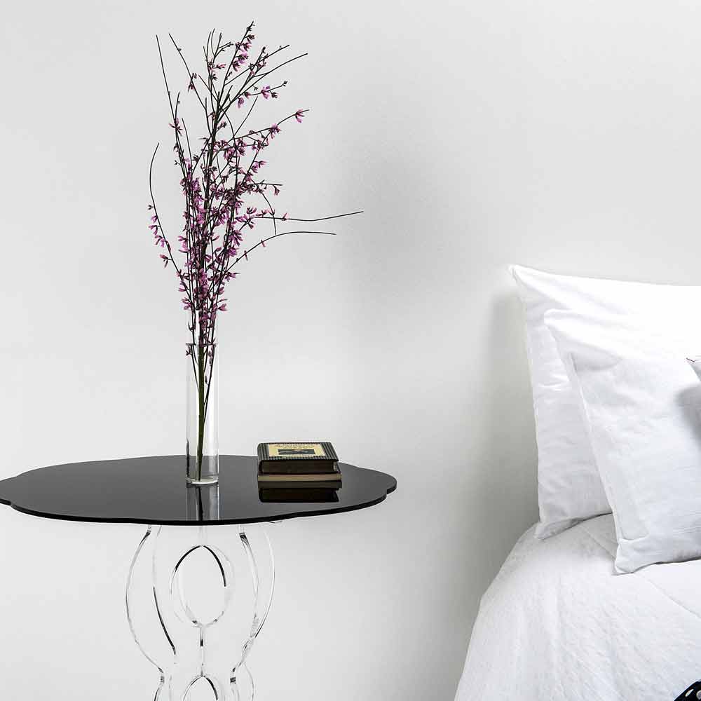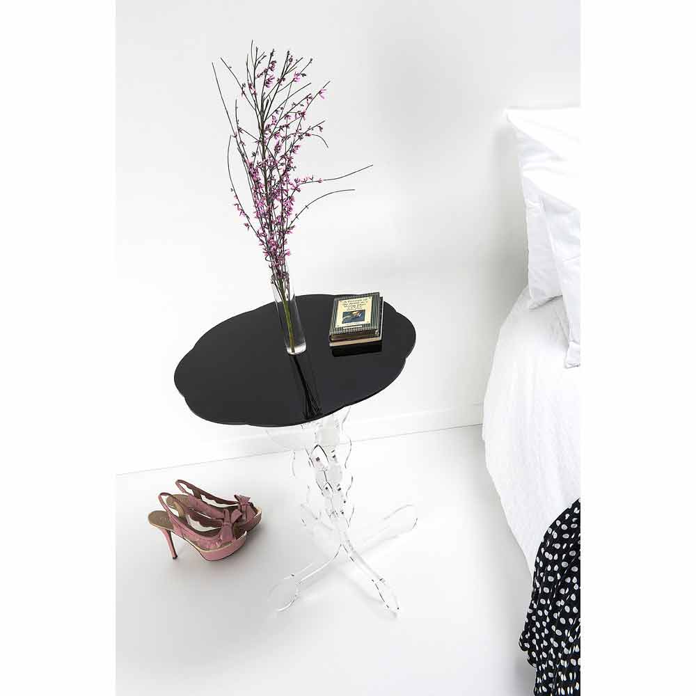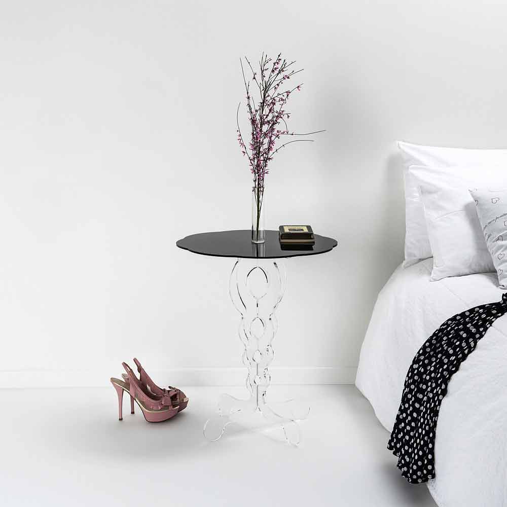 Richiami moreschi per il tavolino Janis nero: la base in plexiglass PMMA 100% da polimero vergine trasparente, sagomata al laser, dona discrezione, mentre il ripiano nero in pigmento pieno conferisce un tocco di colore all' ambiente domestico. Il plexiglass è antiurto, indeformabile, inalterabile e termoisolante. La luminosità e la brillantezza si mantengono costanti ed inalterati nel tempo. Il plexiglass PMMA da polimero vergine utilizzato è atossico, ipoallergico, inodore ed antibatterico. Pensato, progettato e realizzato in Italia, con materiali italiani.