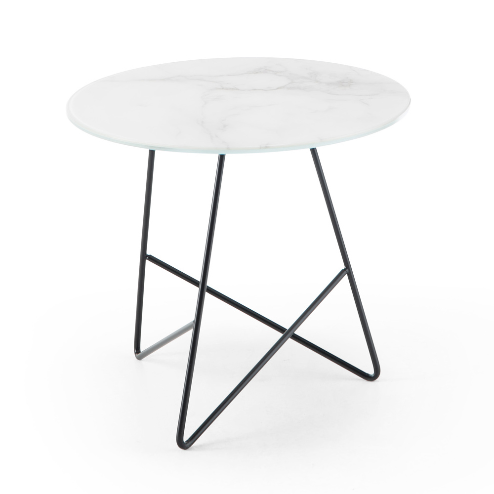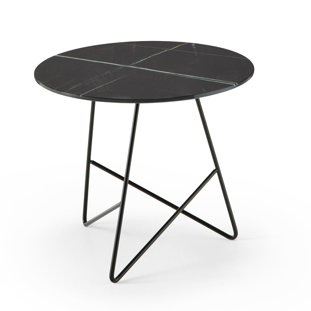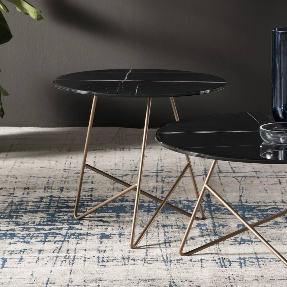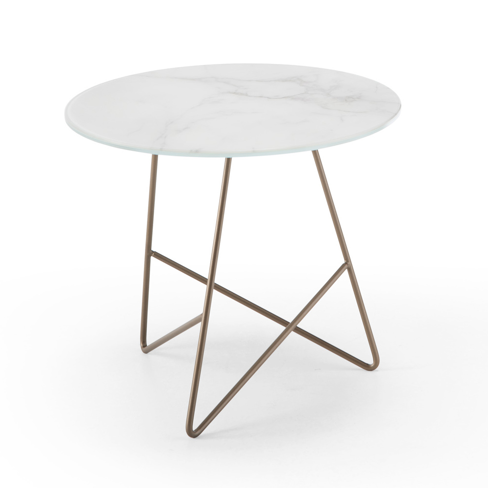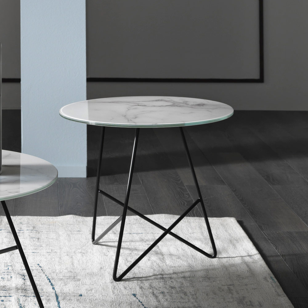 Tavolino da caffè rotondo in metallo e piano in vetro-marmo, articolo di lusso made in Italy.