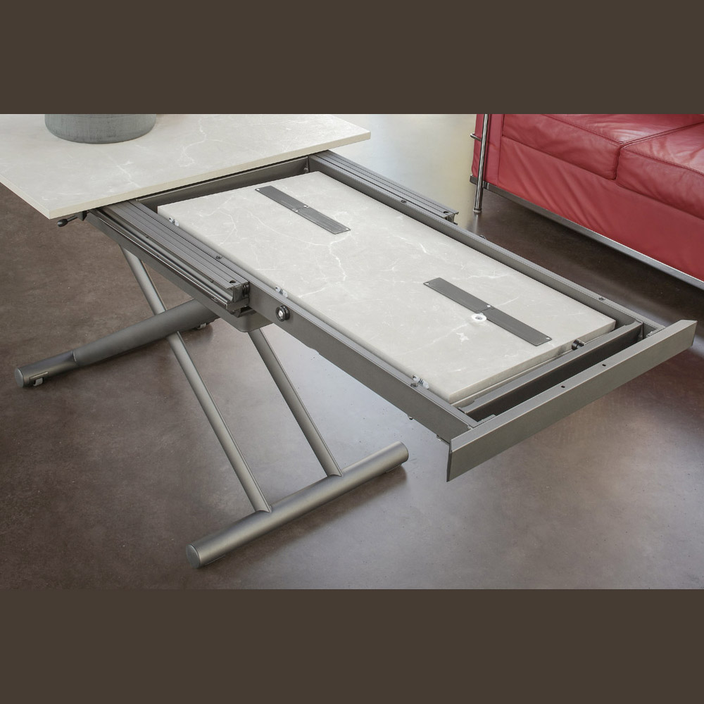 Ma la vera magia avviene quando si trasforma. Con una semplice azione, questo pezzo versatile si eleva e si espande, trasformandosi in un tavolo da pranzo spazioso e accogliente. Il meccanismo è fluido e intuitivo, progettato per offrire la massima funzionalità senza sacrificare lo stile.