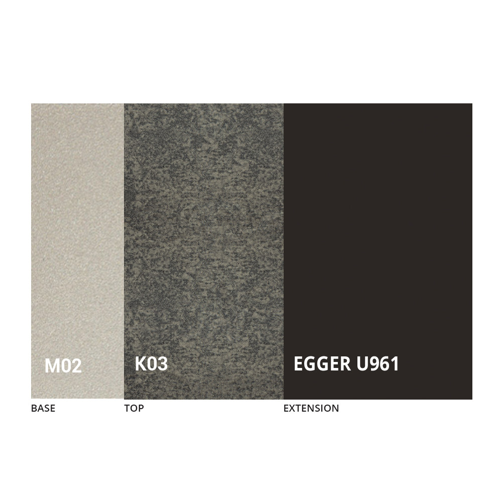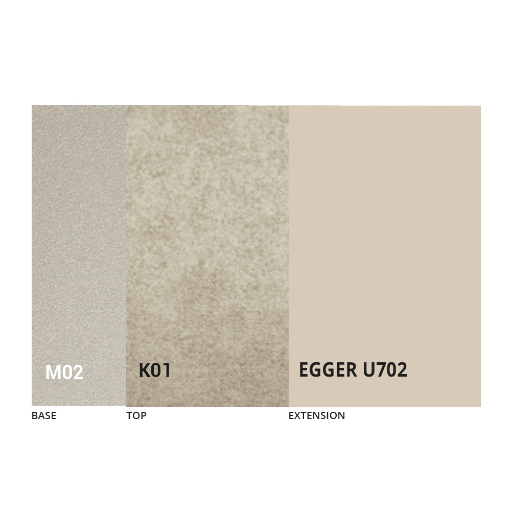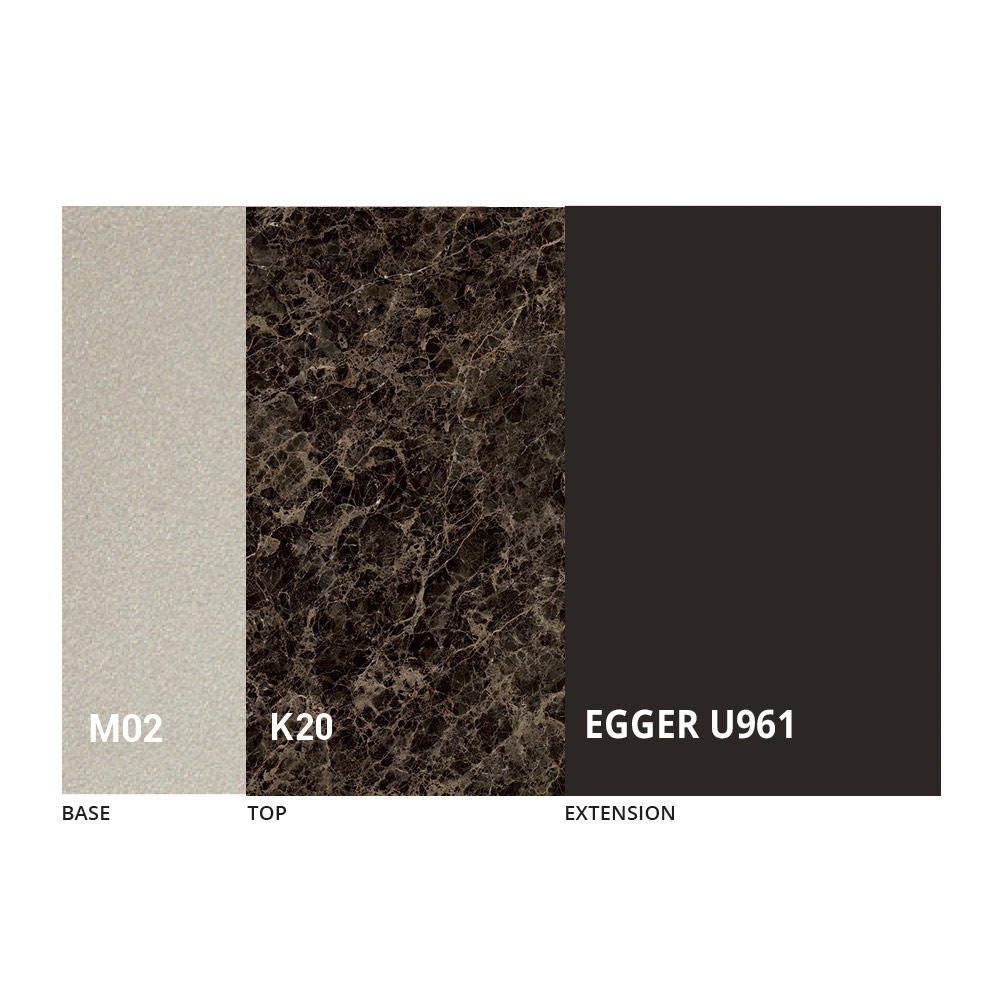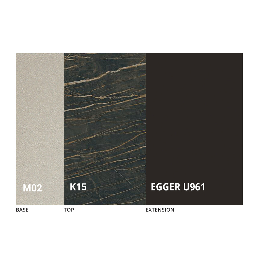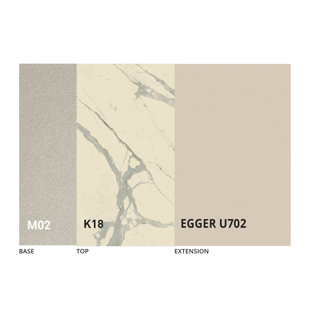 Il piano è disponibile in nobilitato, ceramica opaca, vetro ed effetto malta in una vasta gamma di finiture.