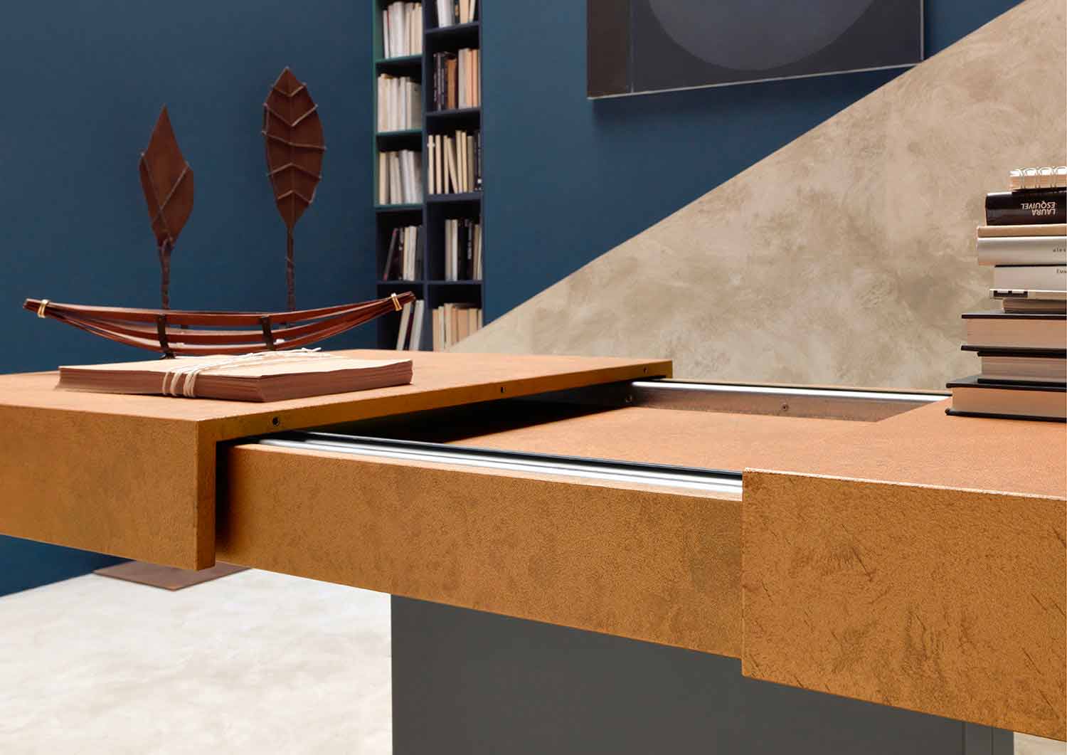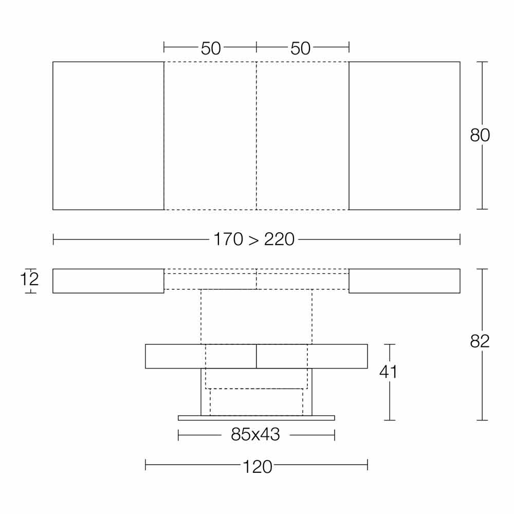 Il piano è rettangolare allungabile attraverso due allunghe (interne) da 50cm ciascuna ed è capace di trasformarsi in tavolo da pranzo grazie al meccanismo gas che regola l'altezza al millimetro: da 41 cm a 82 cm.