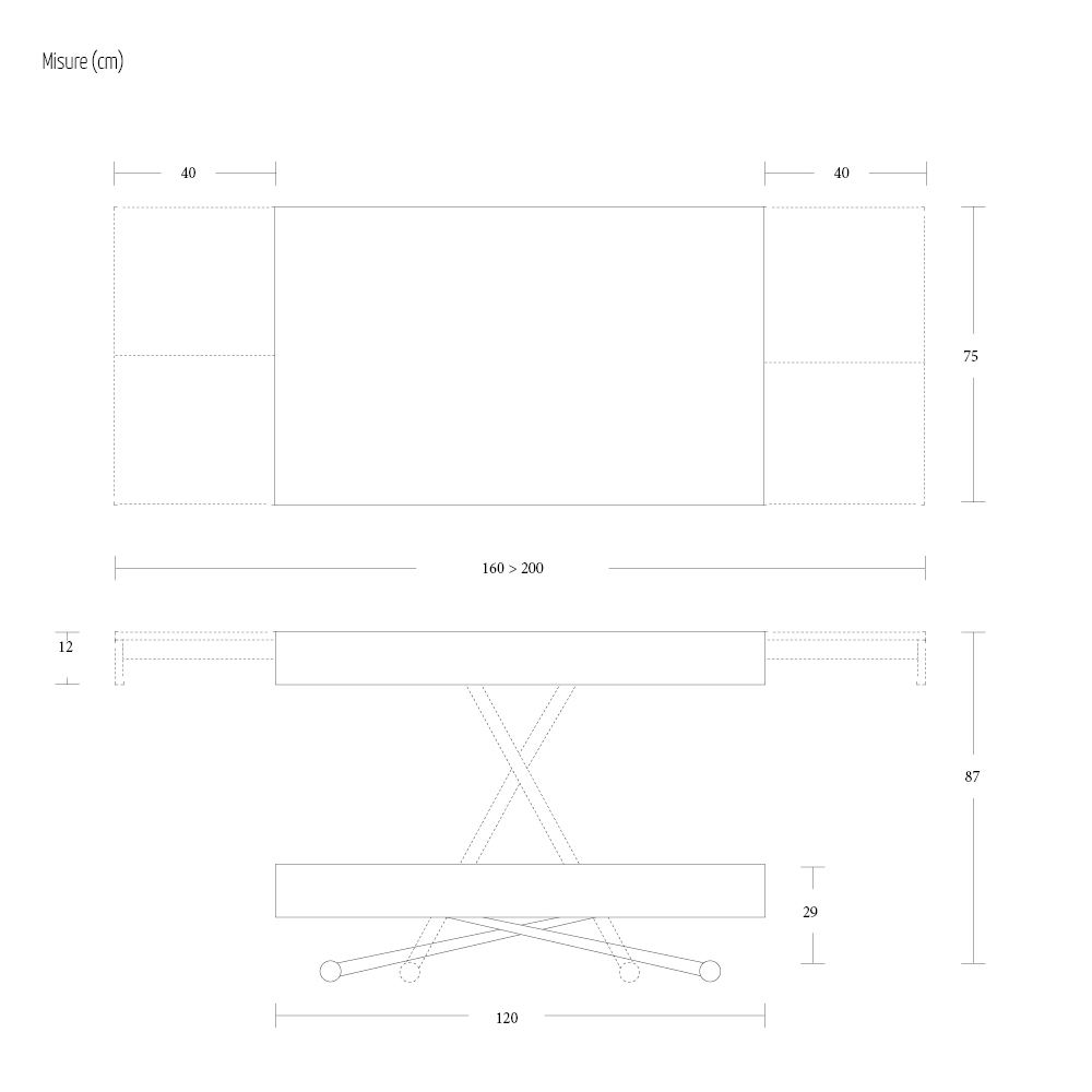 NB: in fase di apertura del tavolino è necessario sollevare l'allunga, posizionarla al livello del piano e, solo successivamente, aprirla.